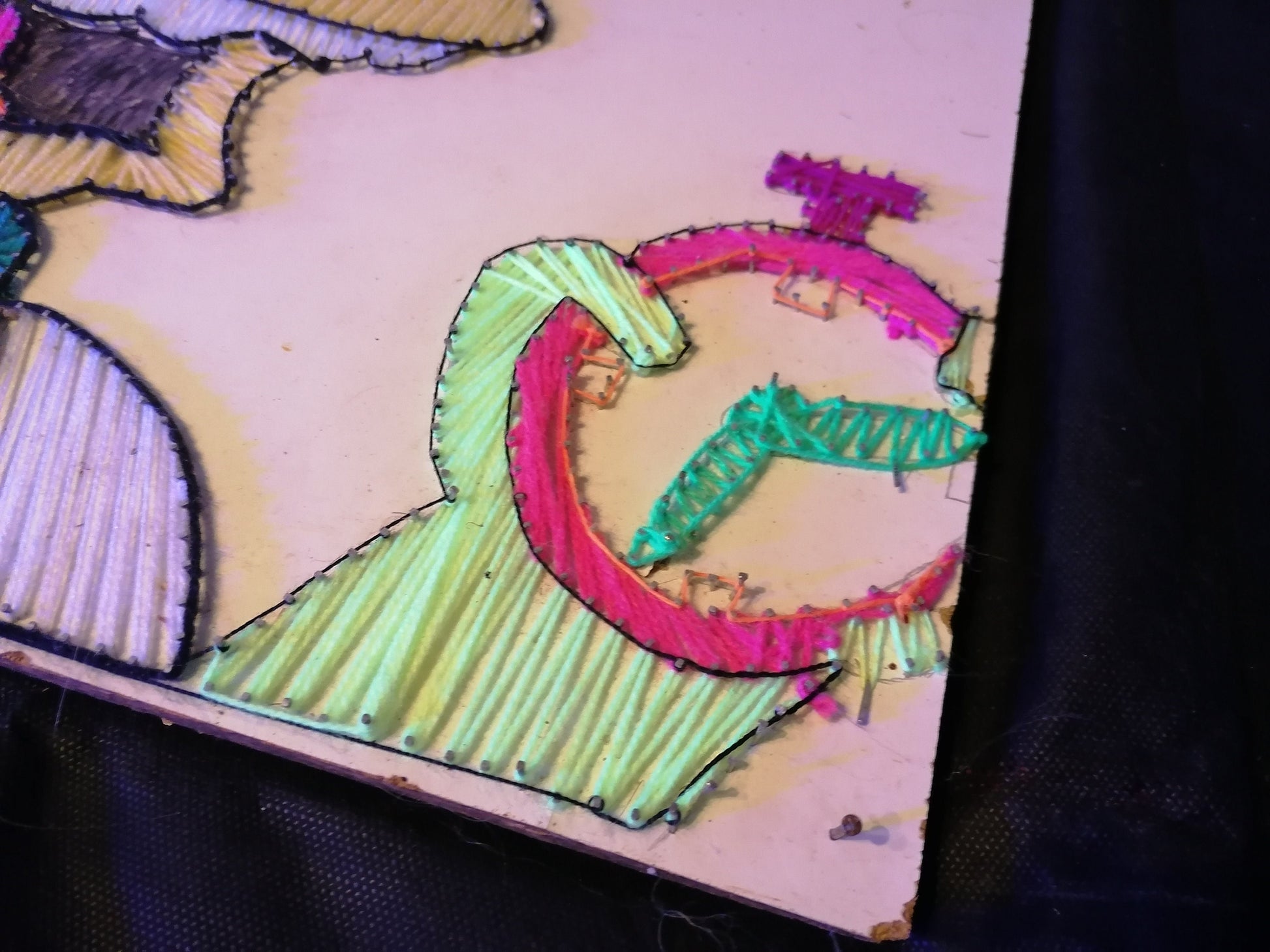 Unter UV-Licht leuchten ausgewählte Fäden dezent auf und verleihen der ansonsten strukturierten 2D-Form einen psychedelischen Akzent.