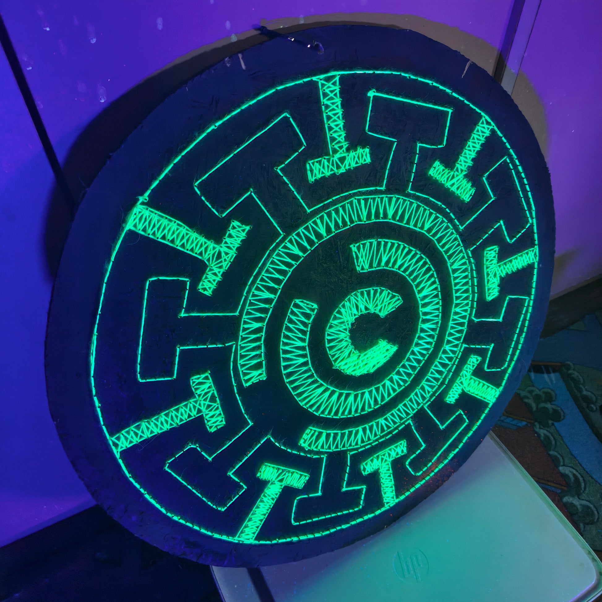 Sous la lumière UV, les fils lumineux révèlent des couches cachées de mouvement et de profondeur, transformant l'œuvre d'art en une expérience psychédélique saisissante.