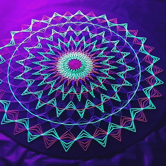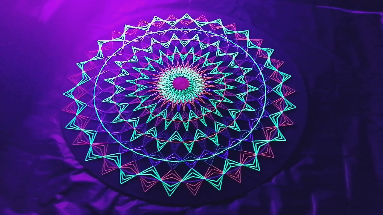 Mandala n°8 est un mandala monumental en 2D réalisé en art du fil UV, qui fusionne symétrie sacrée, composition de couleurs audacieuse et design psychédélique moderne en une seule forme visuelle concentrée.