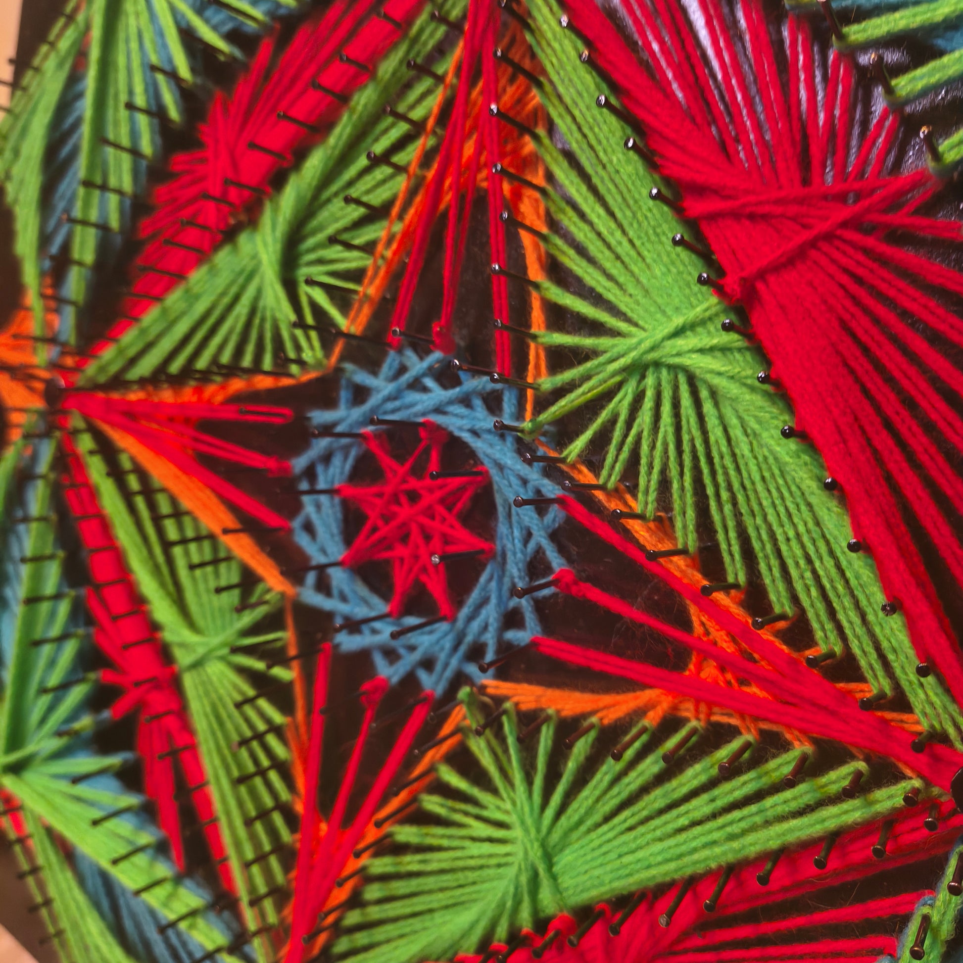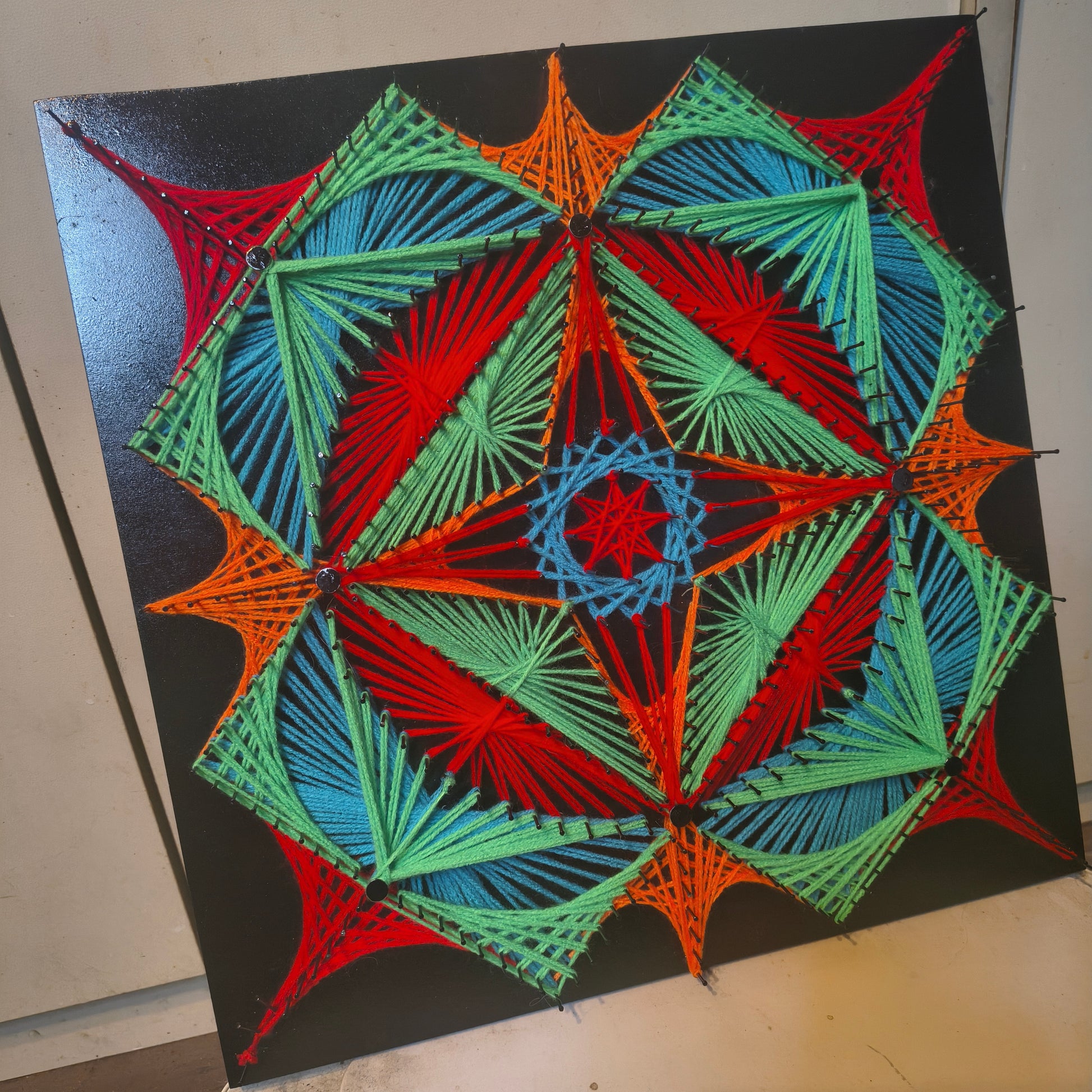 Hand-knitted string art in psychedelic square symmetry