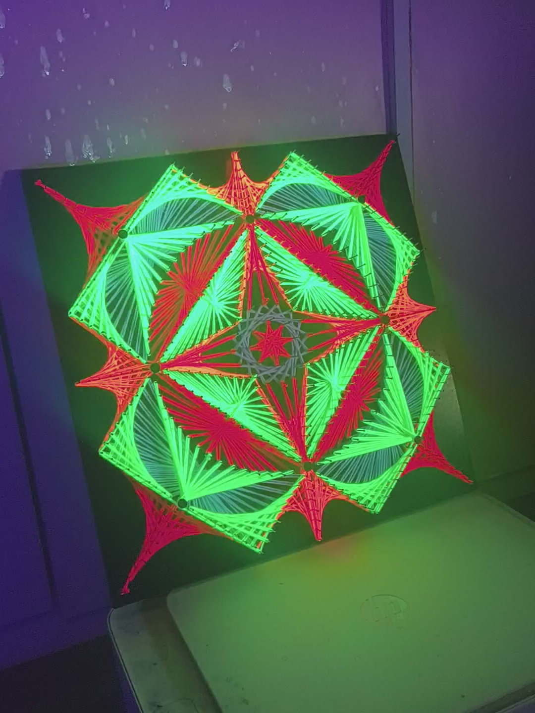 Quatro-symetry is an original hand-knitted string art piece based on square (quatro) symmetry, where geometric precision meets psychedelic color. Every direction, every angle and every line has its exact place – the result is a visually vibrant object that changes expression depending on the light, the angle of view and the surrounding space.