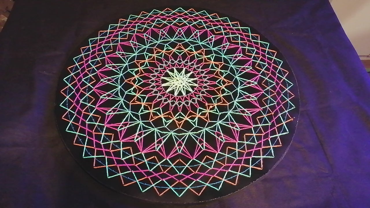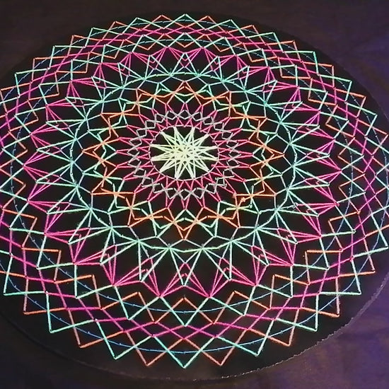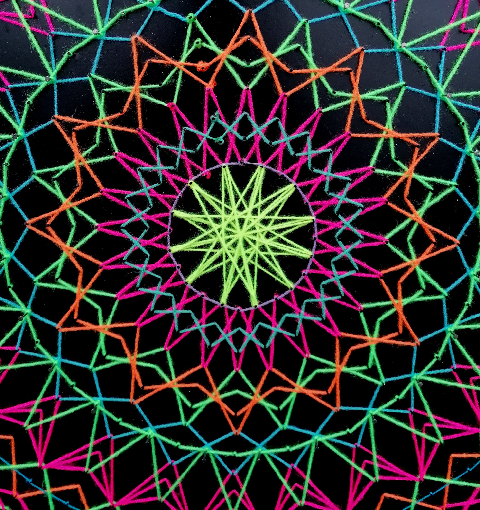 is a handcrafted string art mandala built on precise geometry and layered rhythm