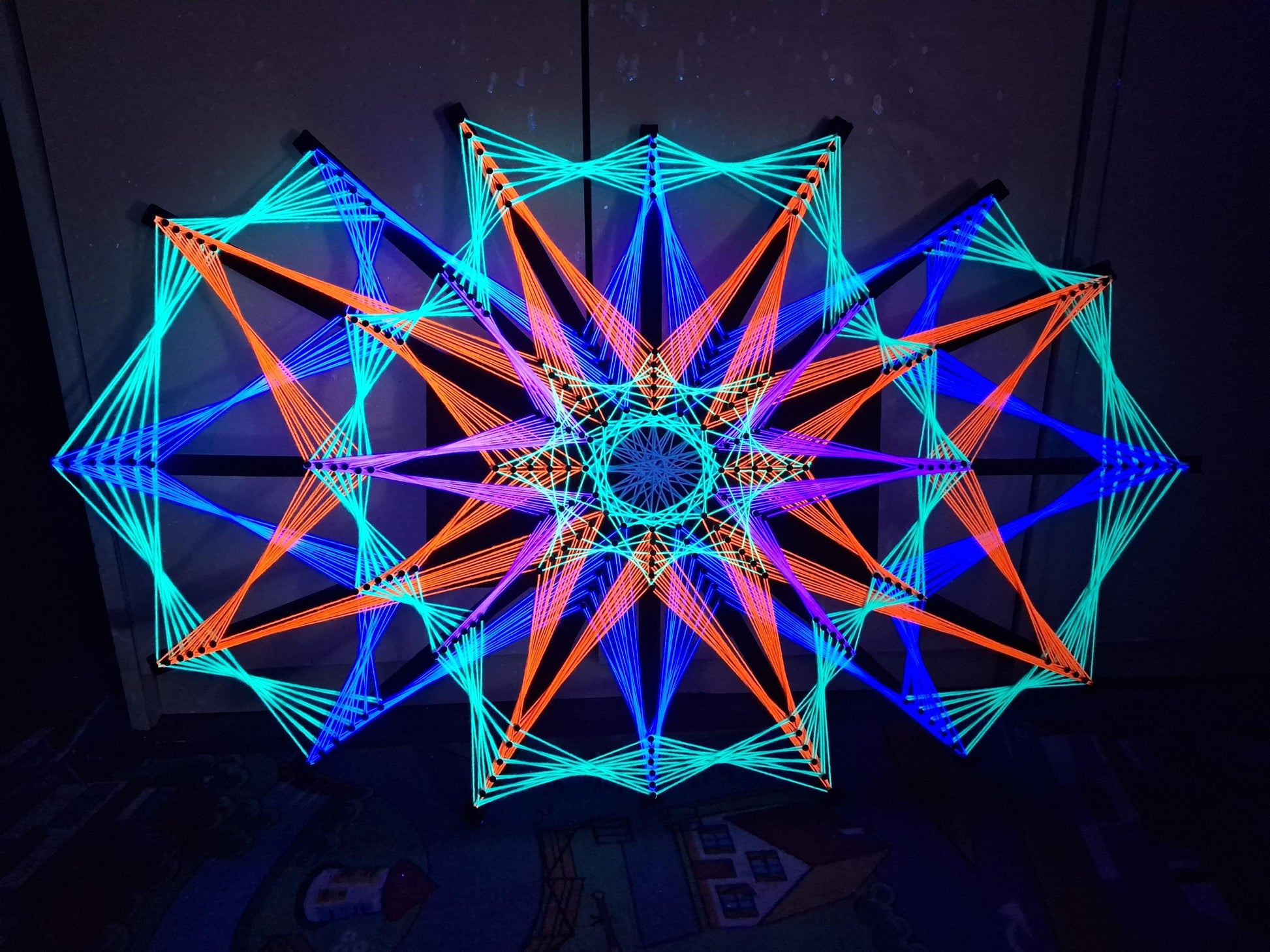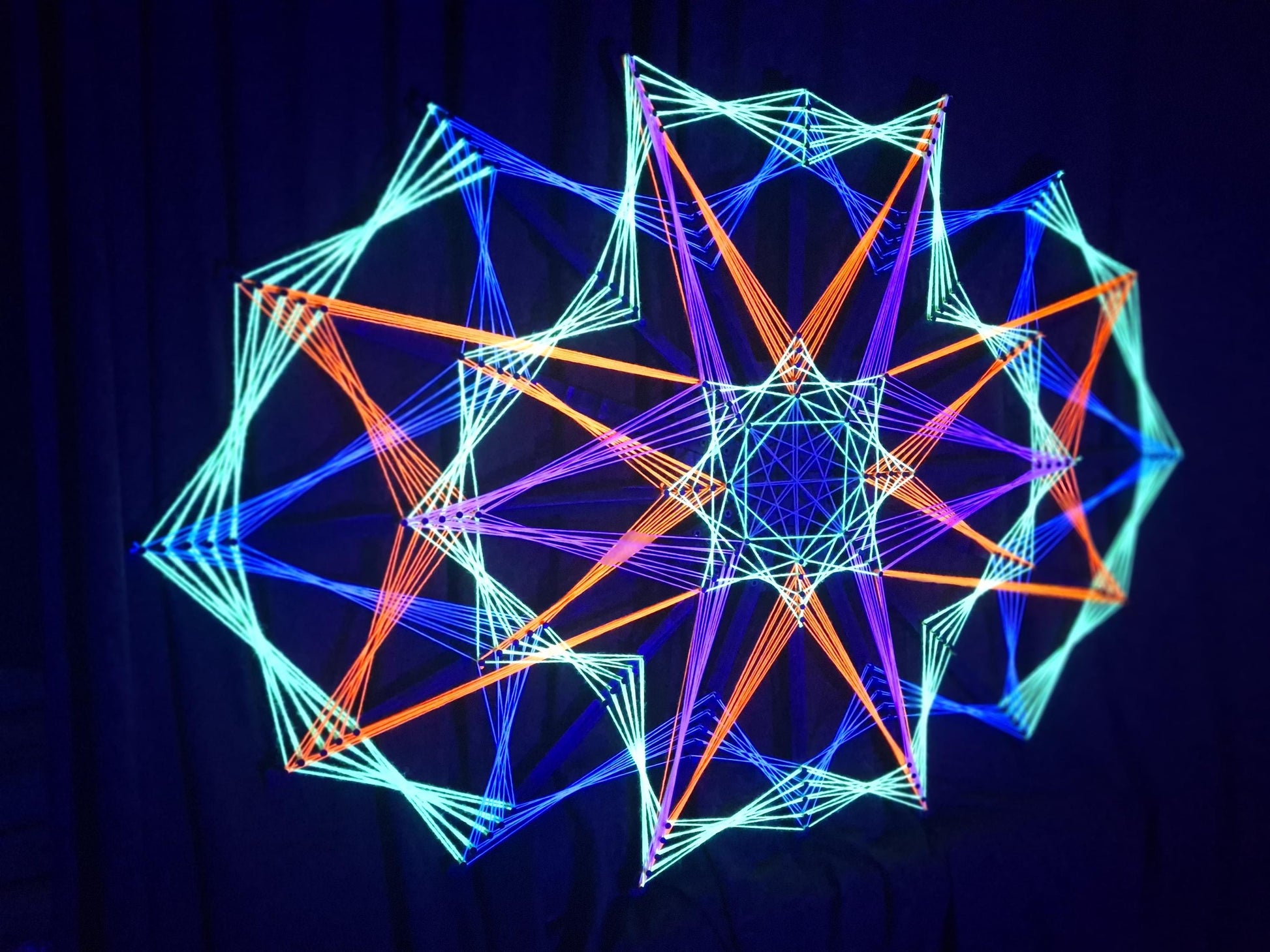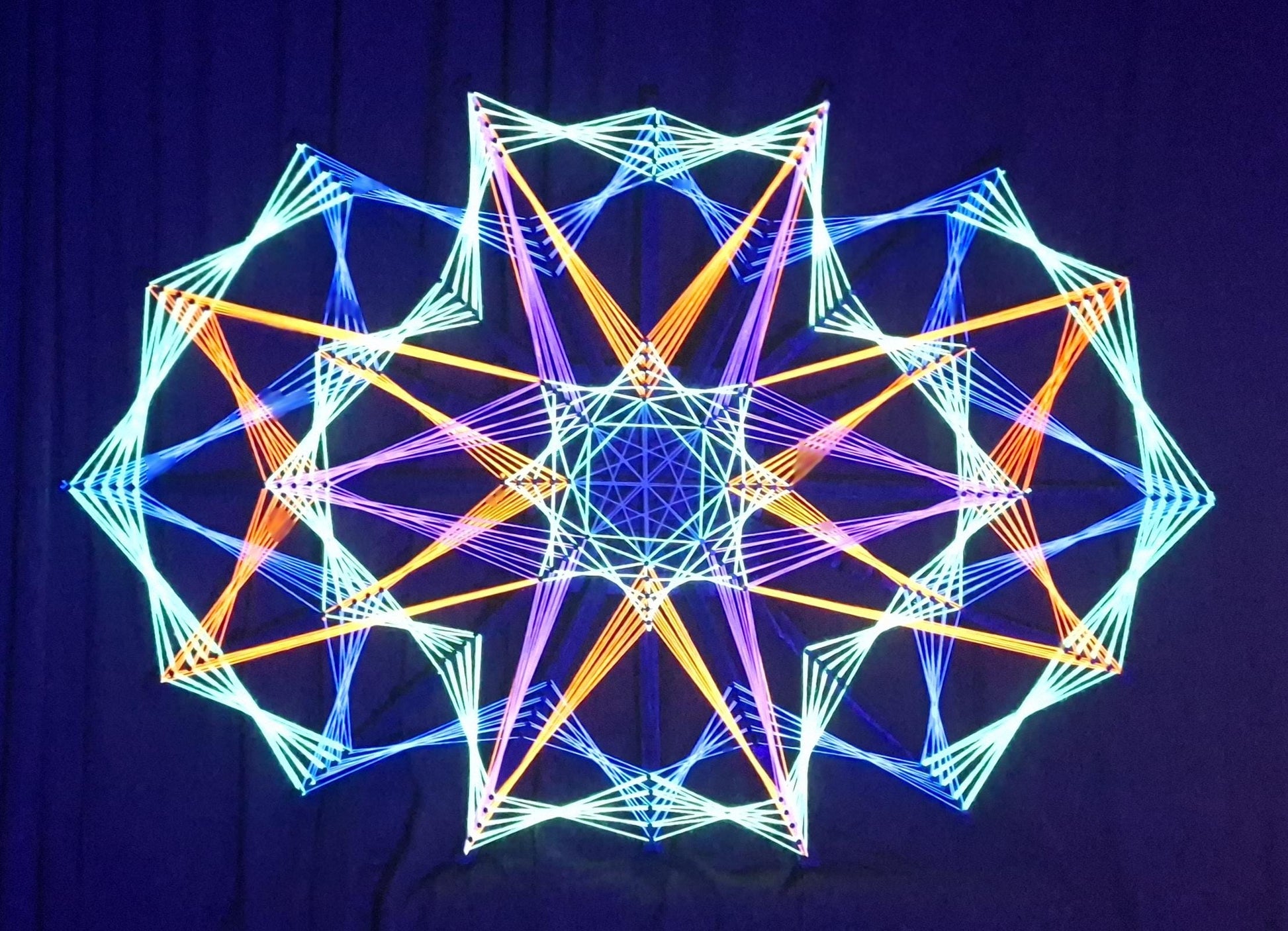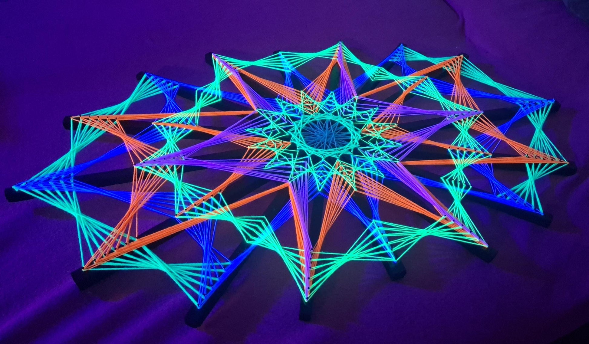 Colorsun is a handcrafted UV-reactive string art mandala designed for homes, festivals, and spaces that welcome color, rhythm, and conscious visual energy. This artwork carries the clear signature of Psybell – String Art and exists firmly outside mass production. It is niche art, created with intention and personal style rather than trend-following design.