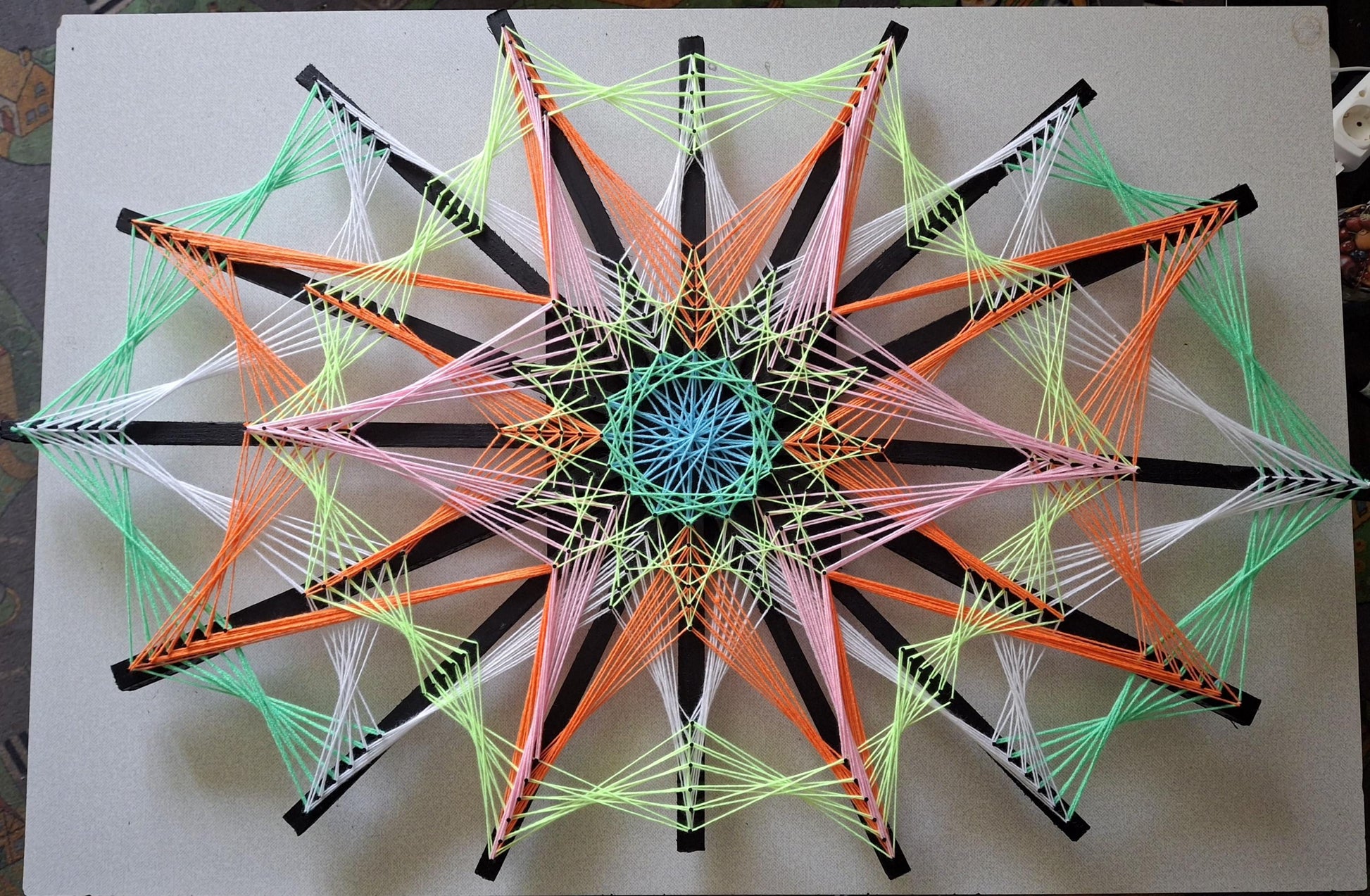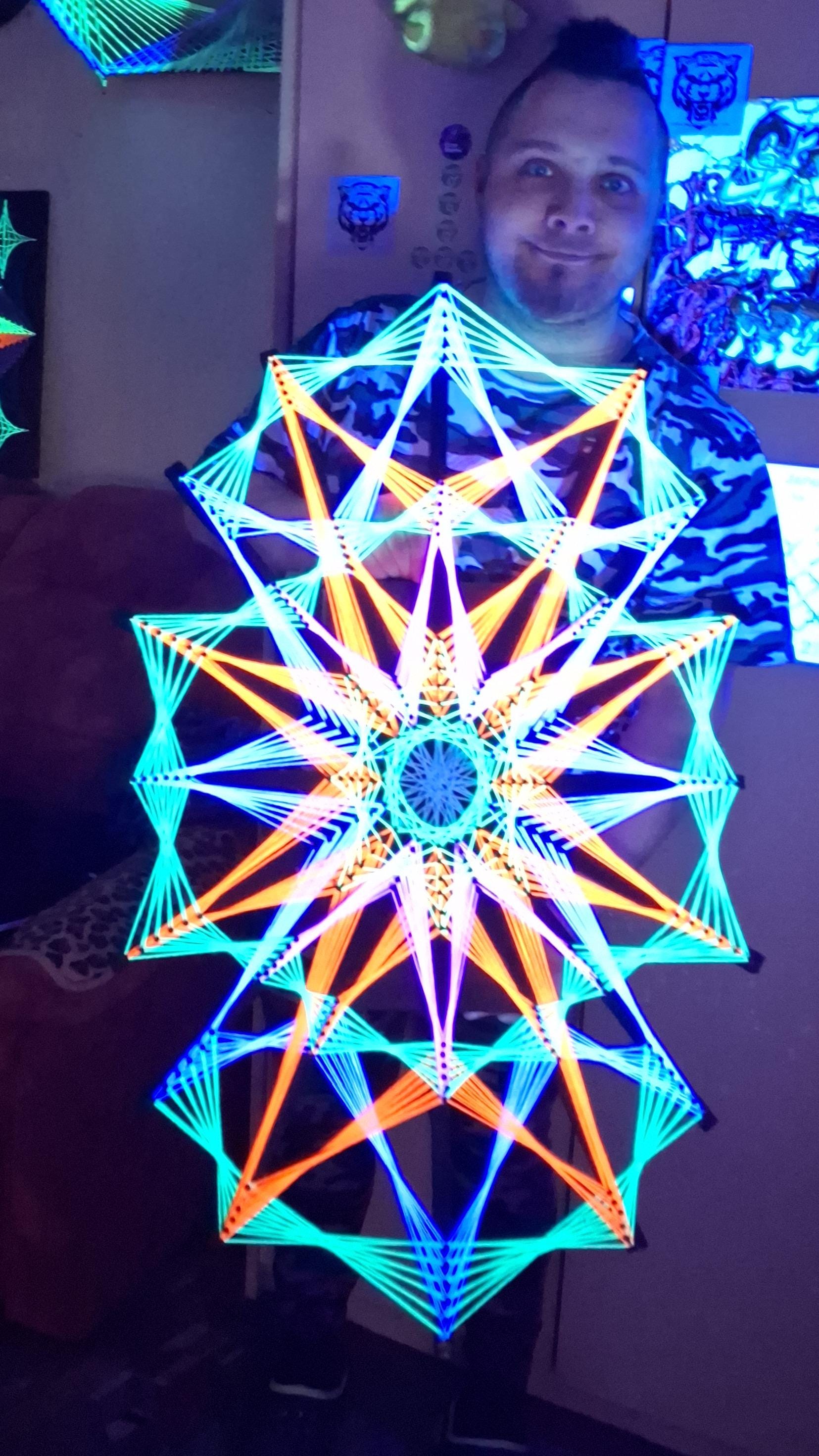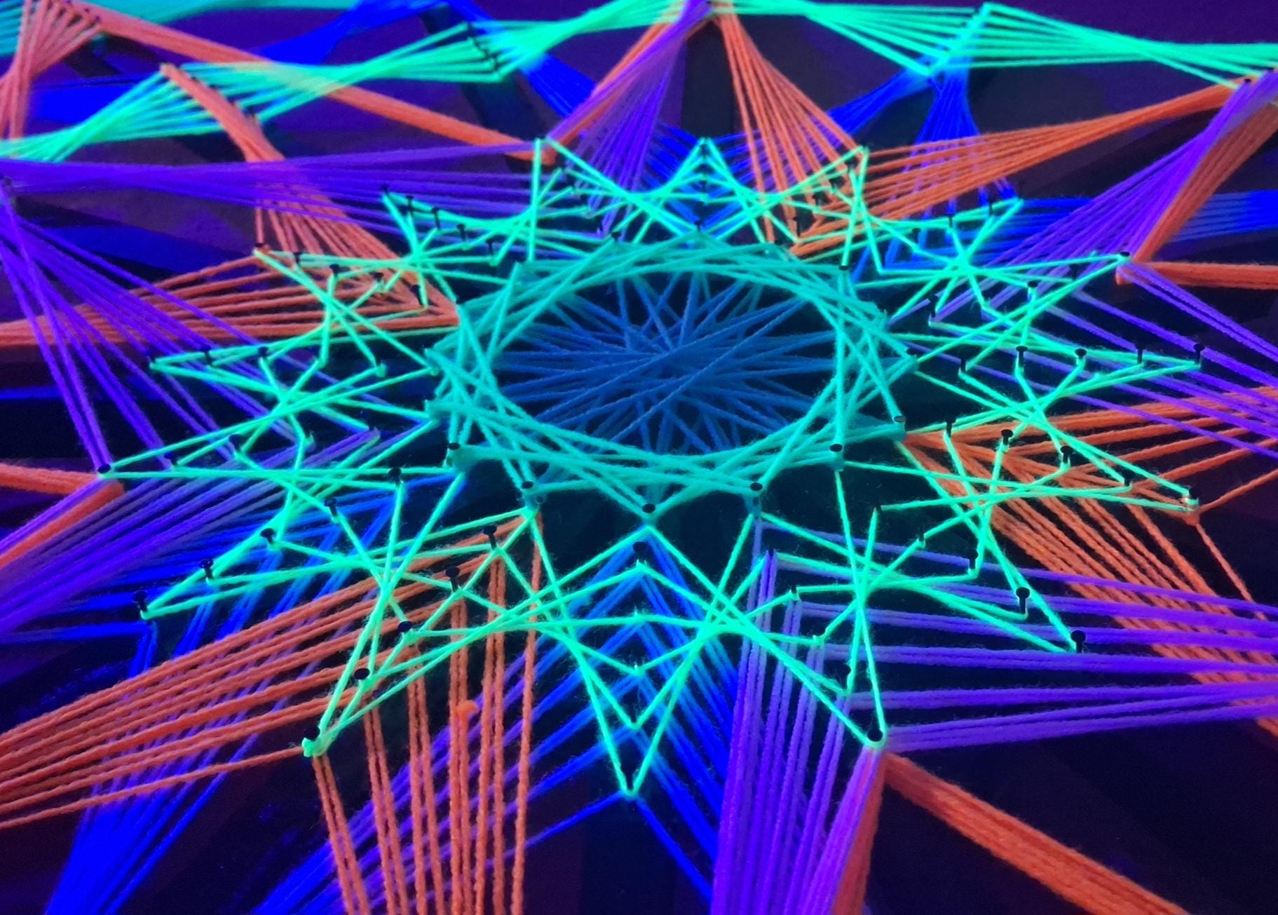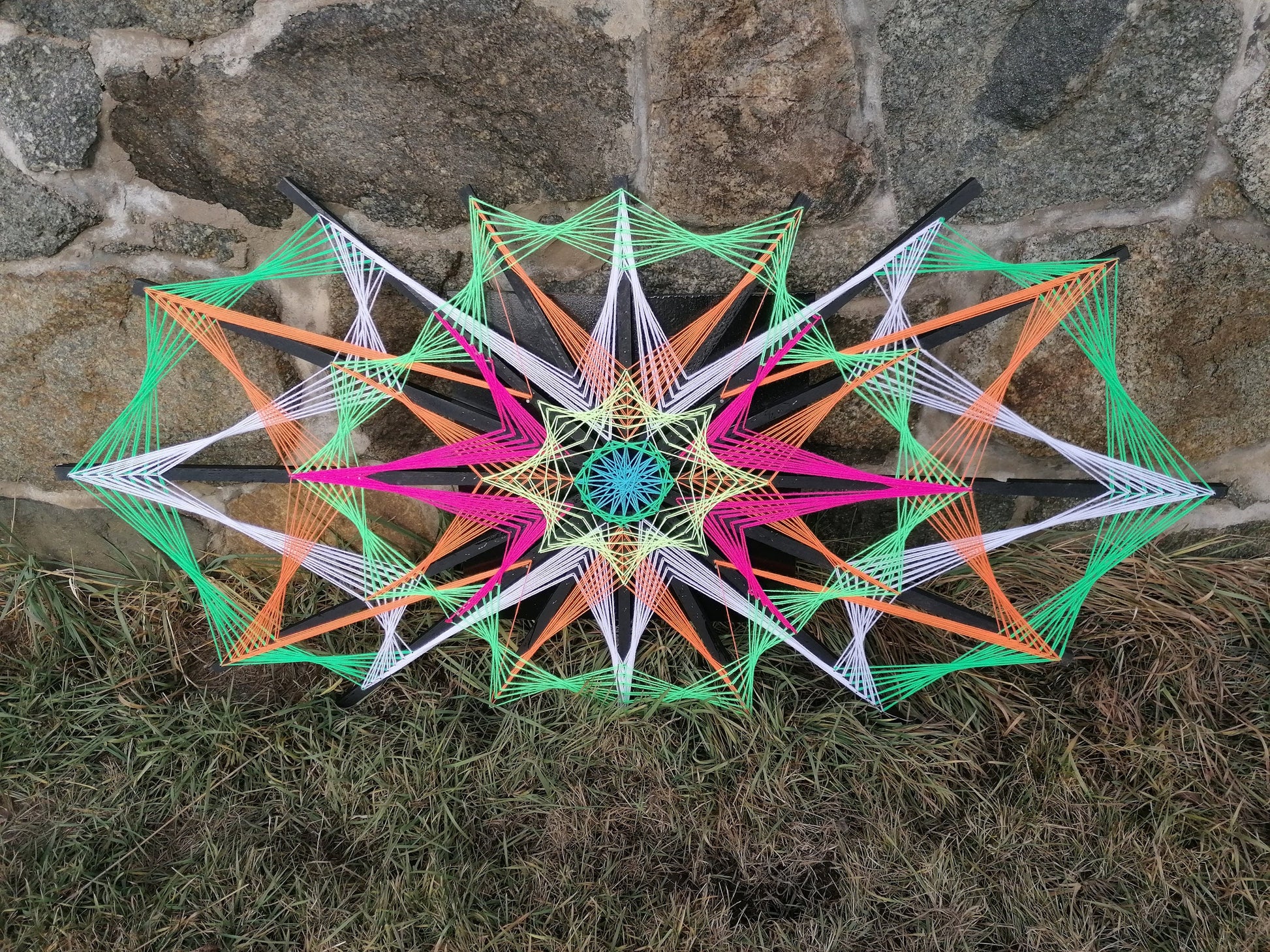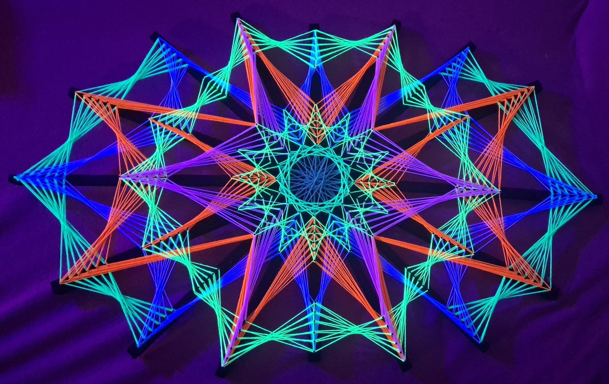 Colorsun is a handcrafted UV-reactive string art mandala designed for homes, festivals, and spaces that welcome color, rhythm, and conscious visual energy. This artwork carries the clear signature of Psybell – String Art and exists firmly outside mass production. It is niche art, created with intention and personal style rather than trend-following design.