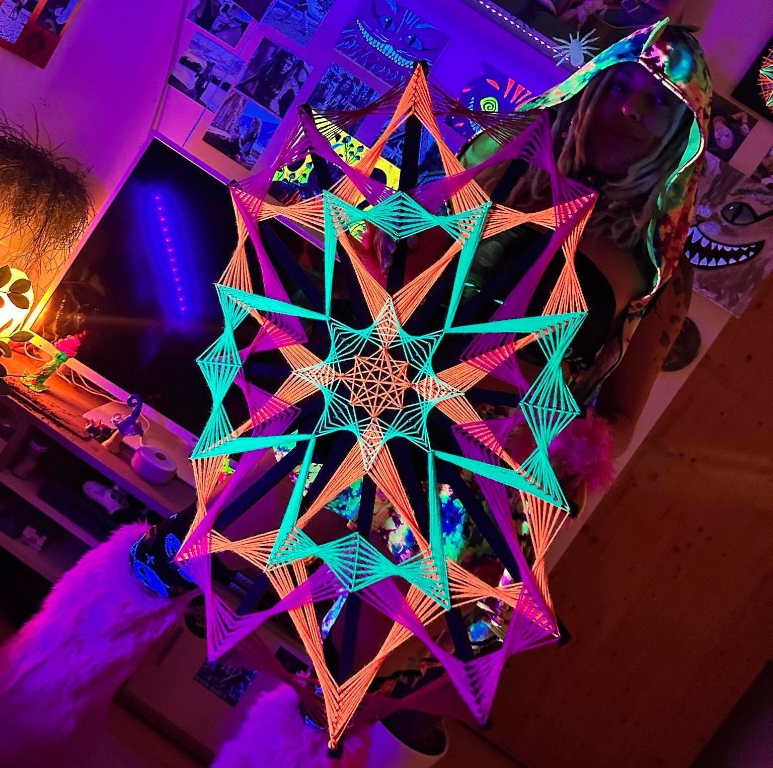 Under UV light, the threads come alive, amplifying contrast and creating a striking trippy effect that instantly energizes the surrounding space.