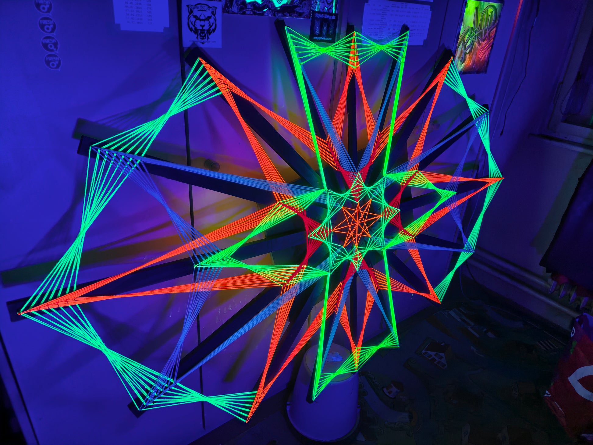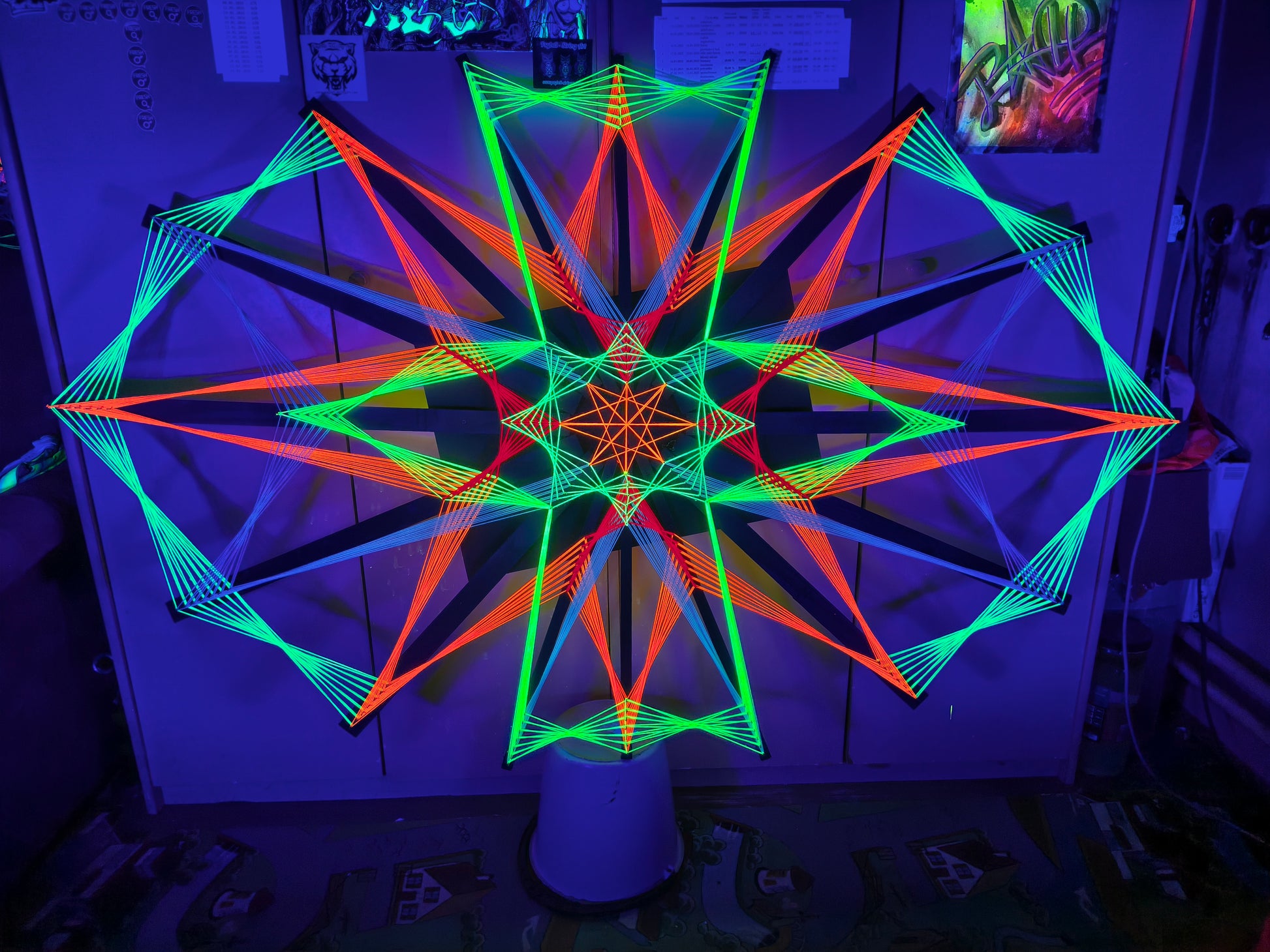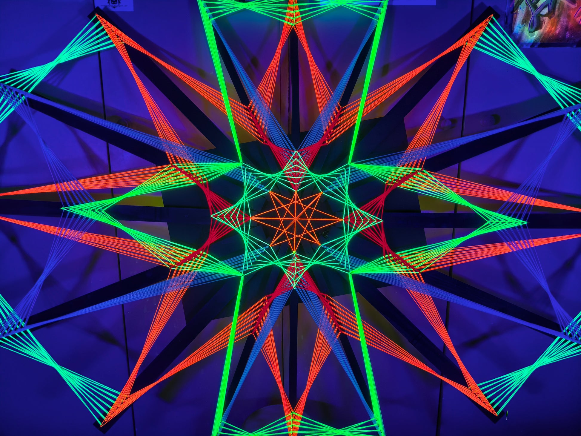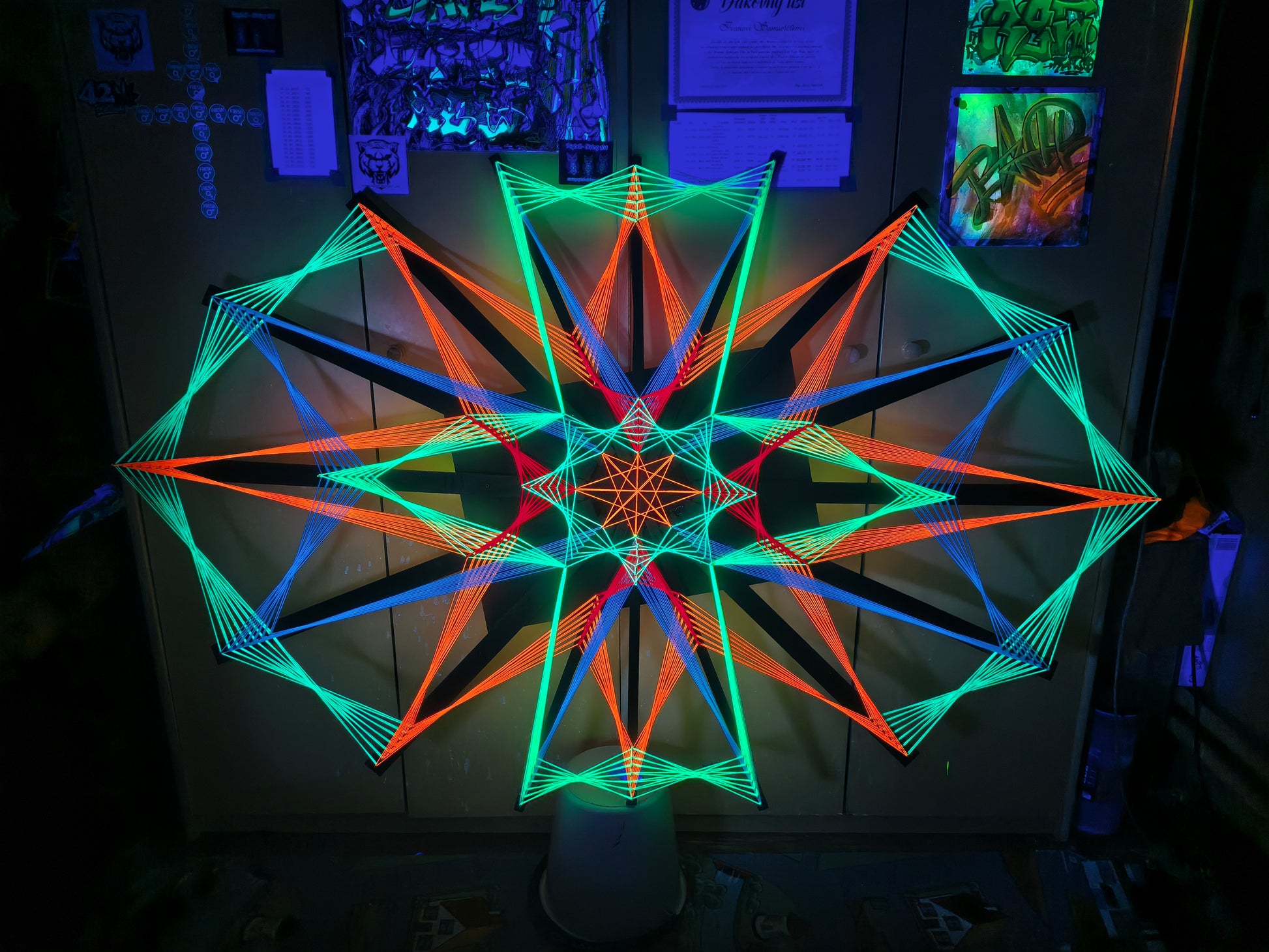 Under UV or blacklight, the UV-reactive synthetic acrylic cotton transforms the artwork into a glowing, high-contrast visual field with strong psychedelic energy 🔮