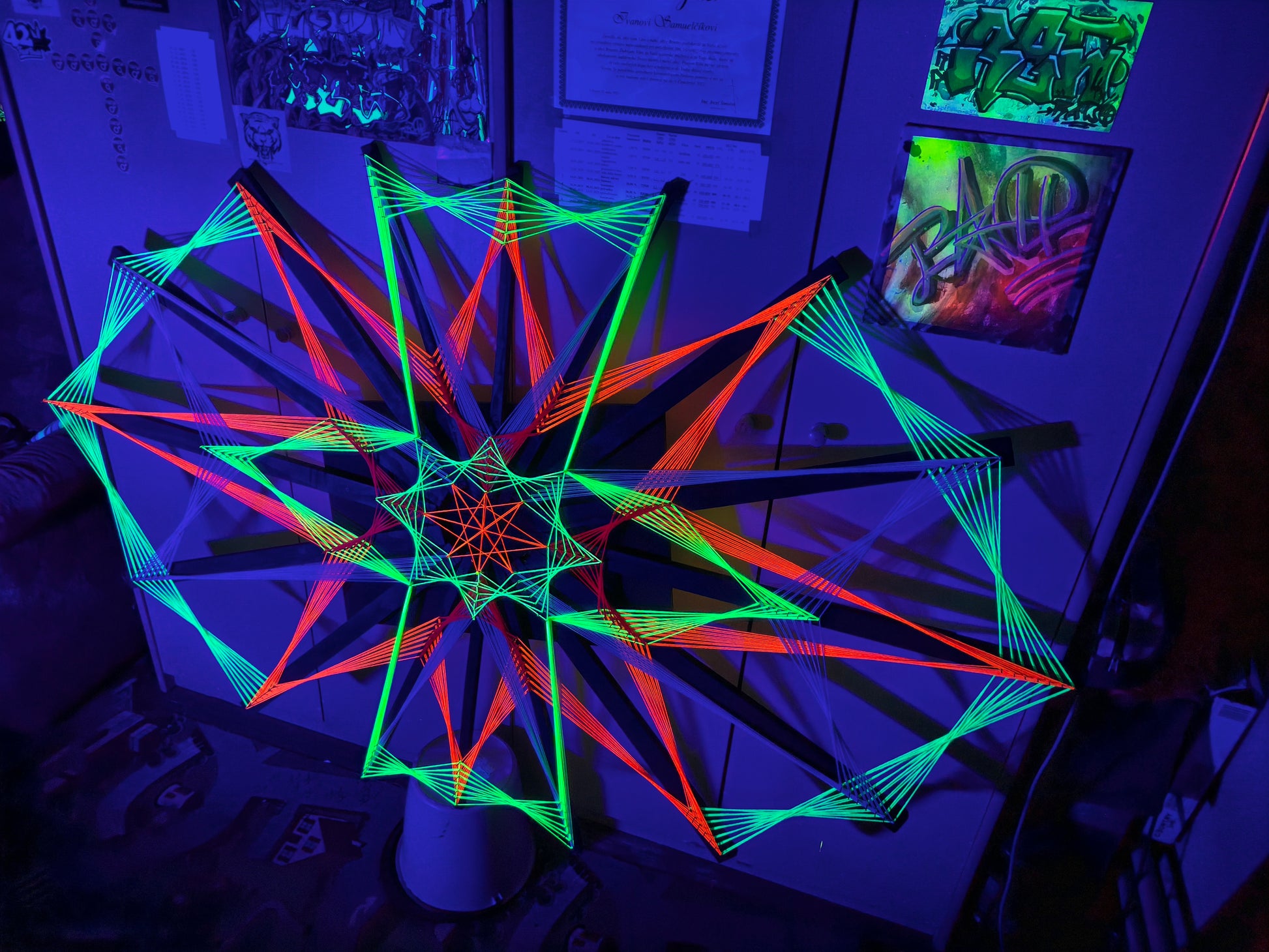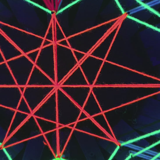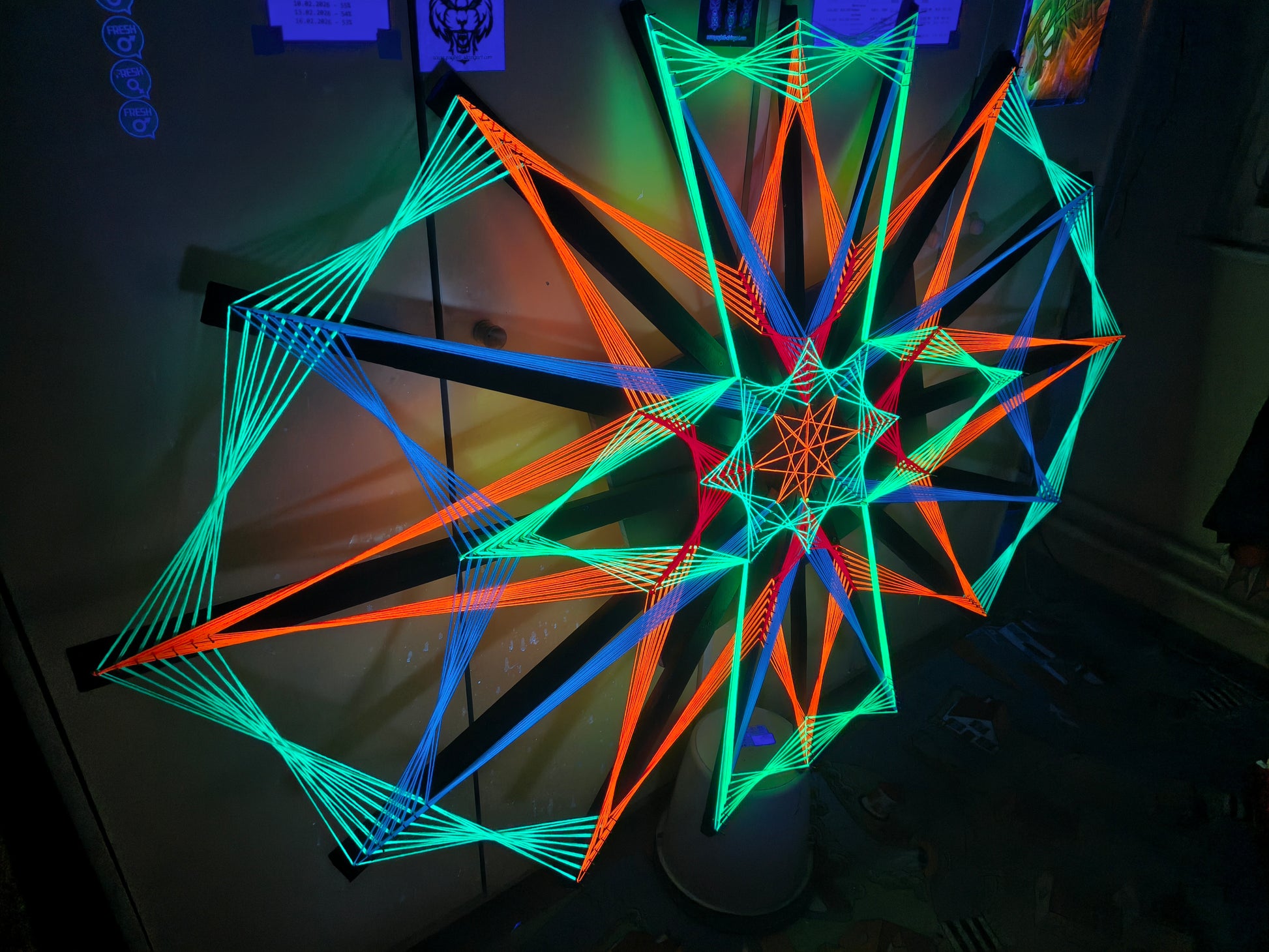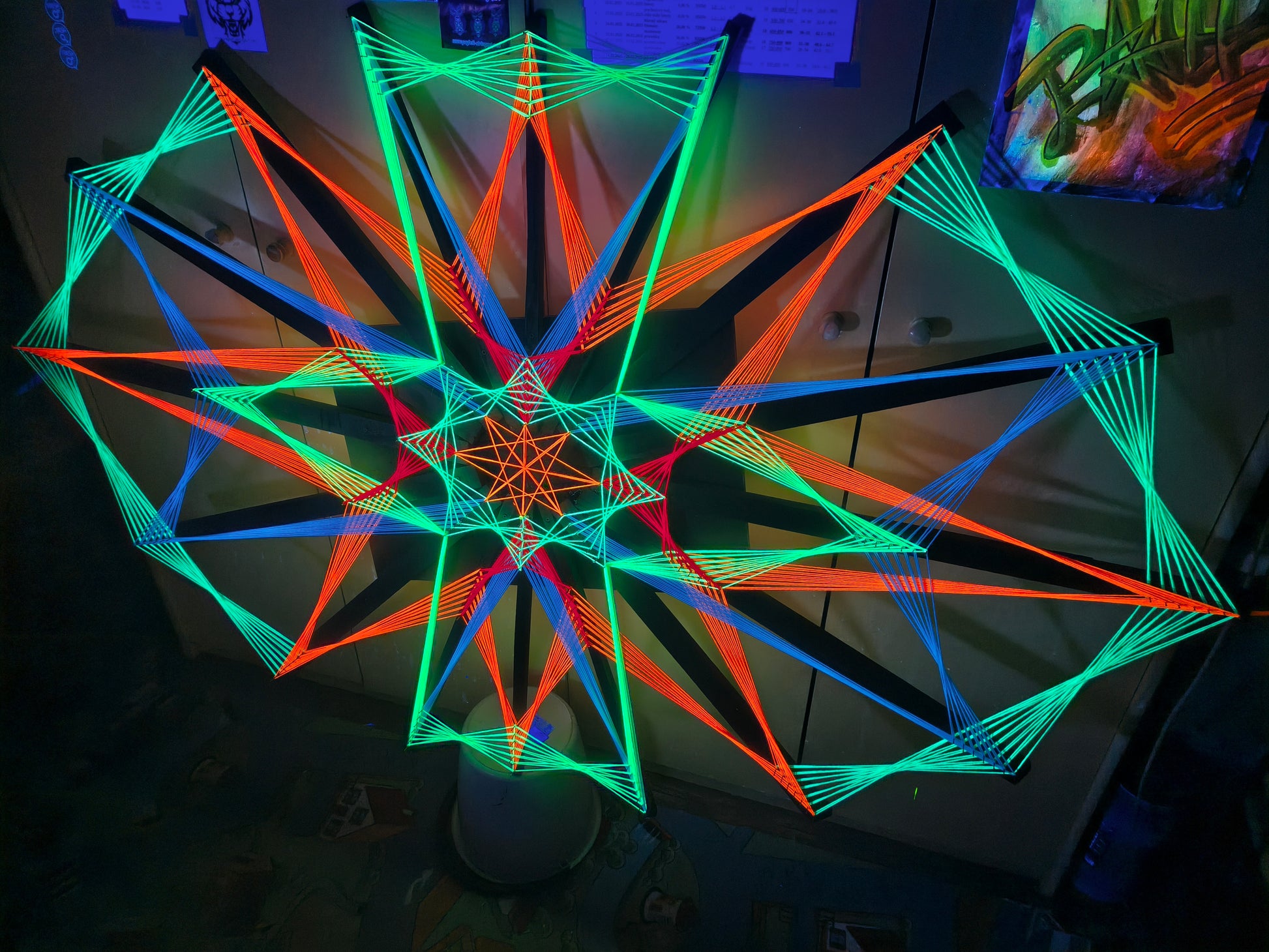Under UV or blacklight, the UV-reactive synthetic acrylic cotton transforms the artwork into a glowing, high-contrast visual field with strong psychedelic energy 🔮