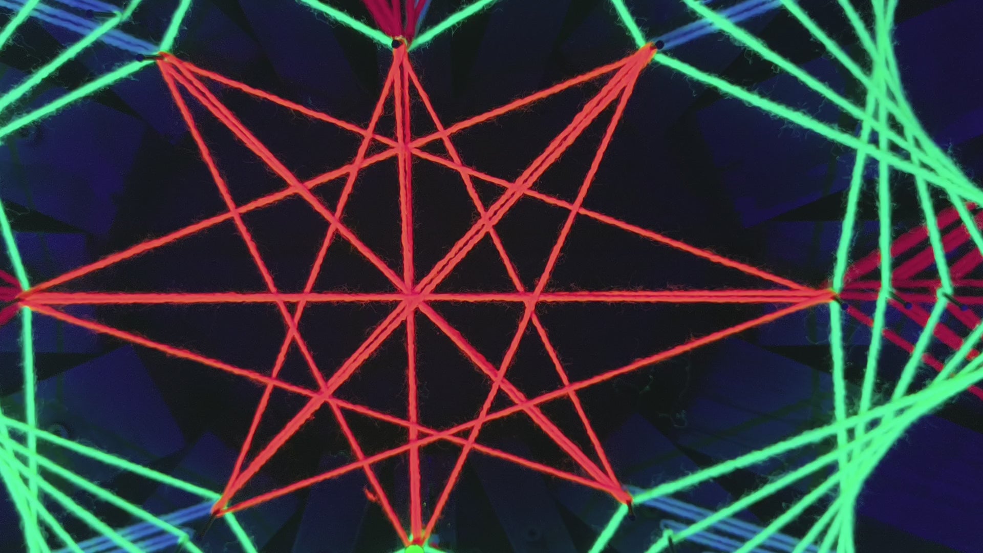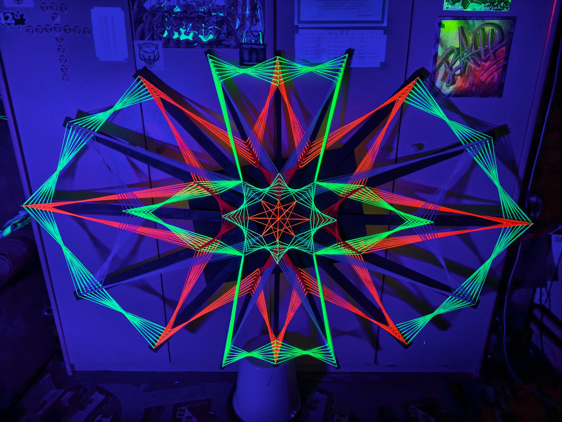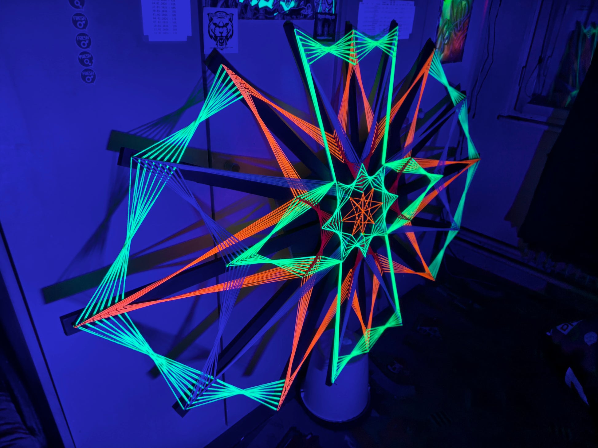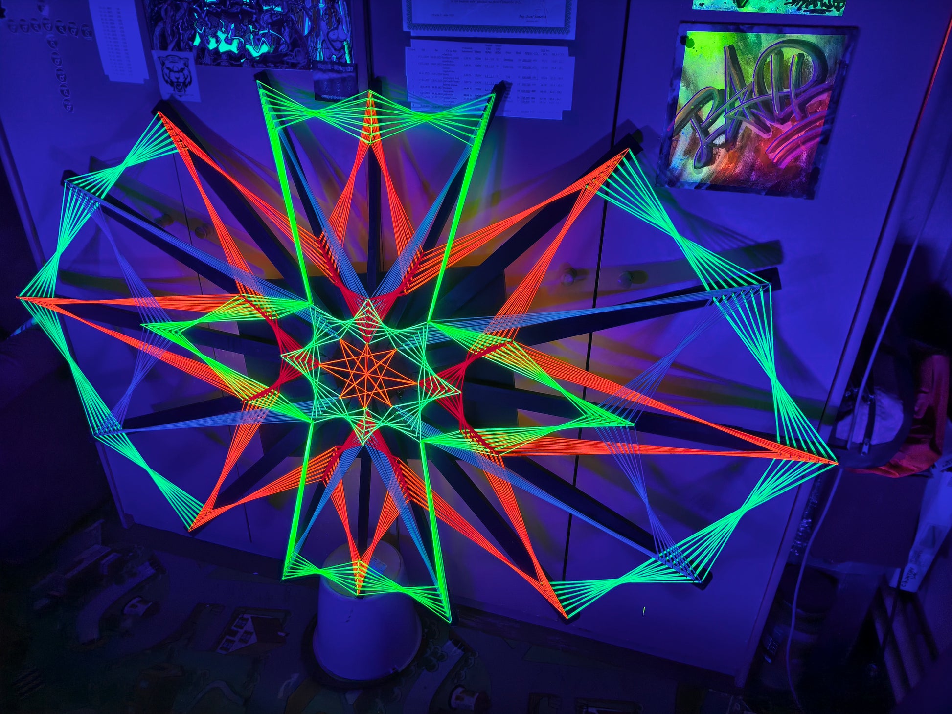 Under UV or blacklight, the UV-reactive synthetic acrylic cotton transforms the artwork into a glowing, high-contrast visual field with strong psychedelic energy 🔮