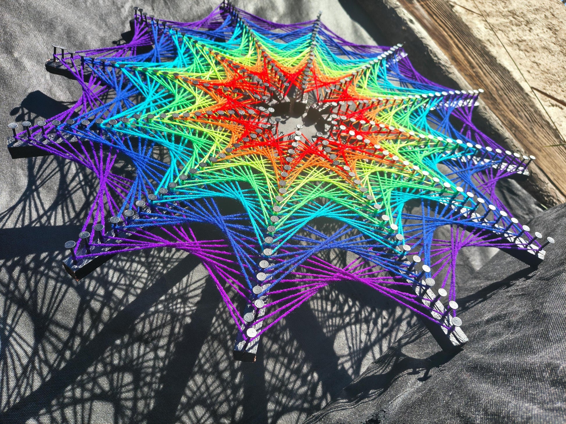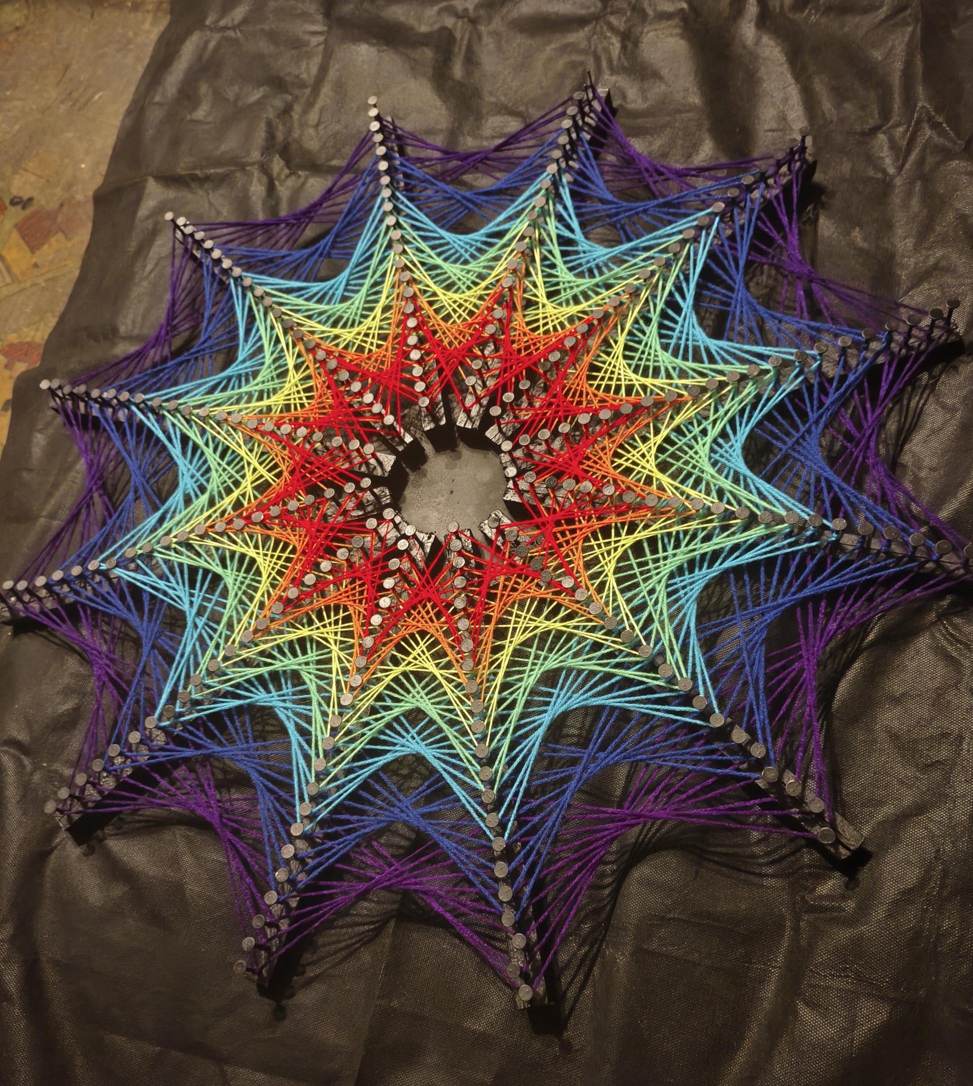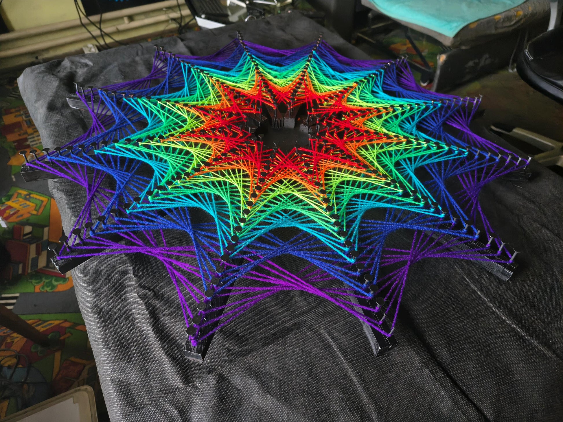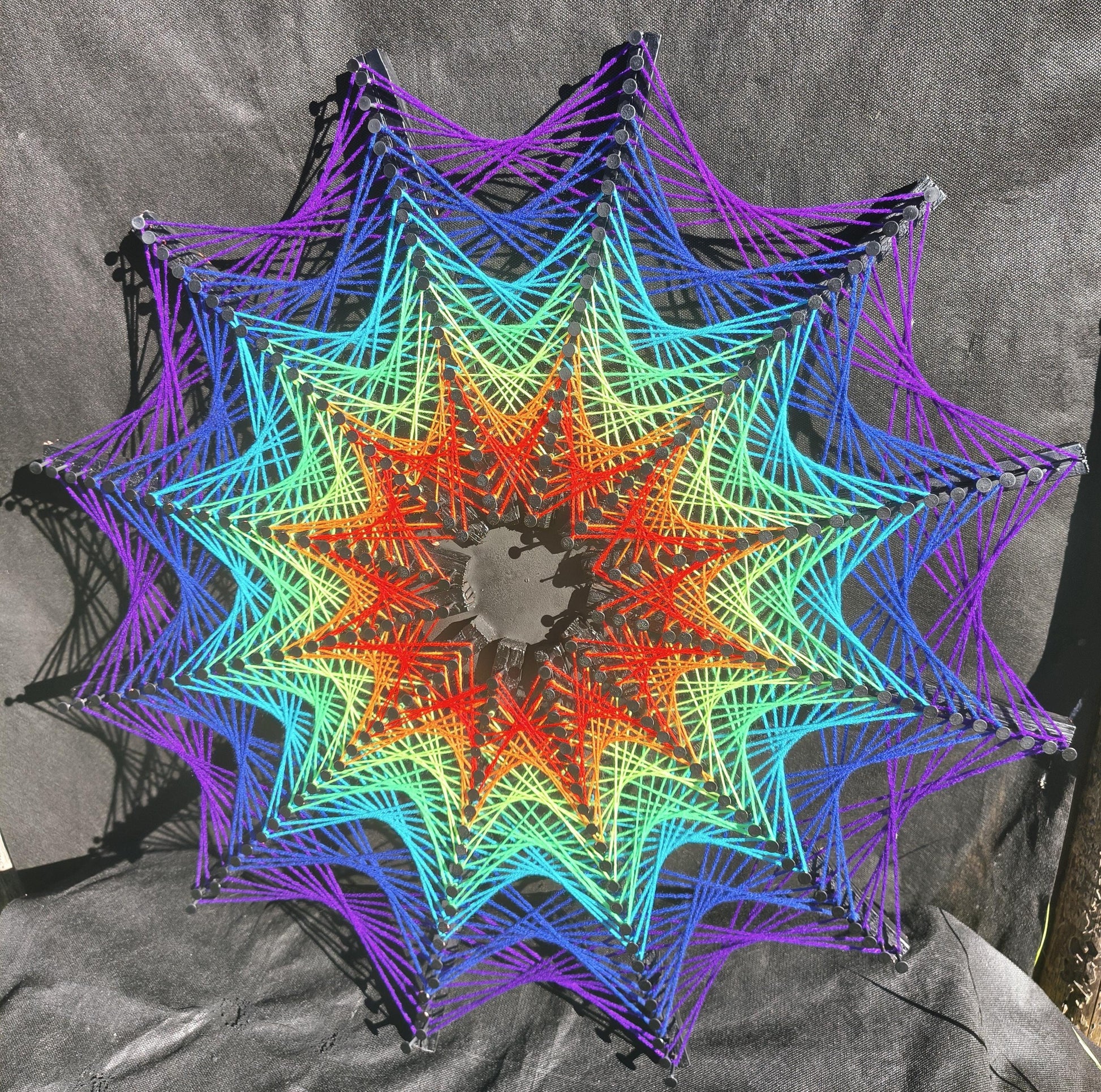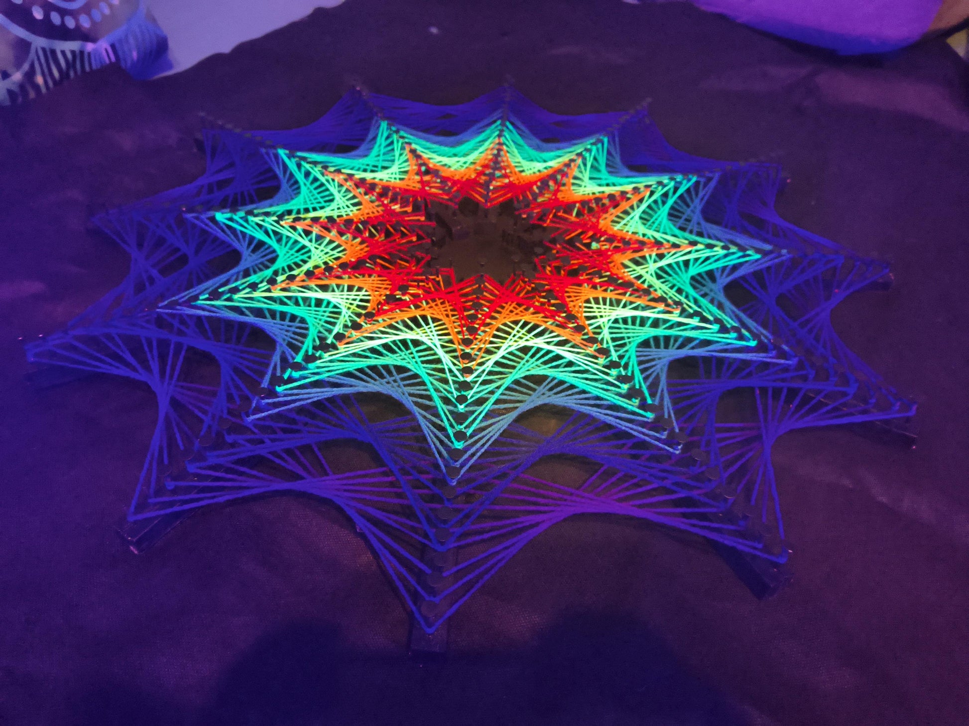 Stargate Psybell is a unique, hand-crafted string art mandala that radiates dynamic energy and evokes a deep, cosmic atmosphere. Each layer of threads creates a visual gateway — a star portal that comes alive especially under UV light.