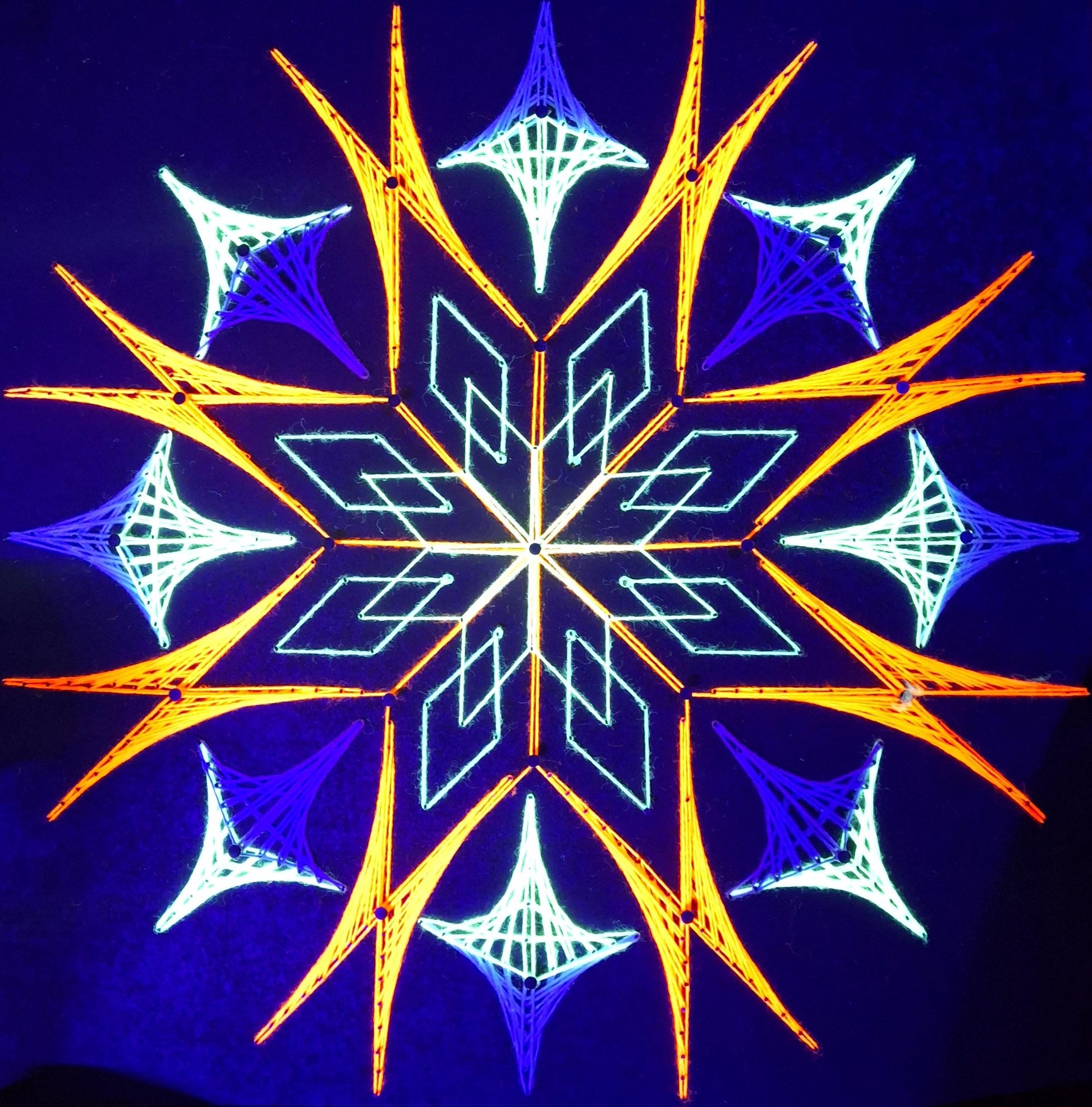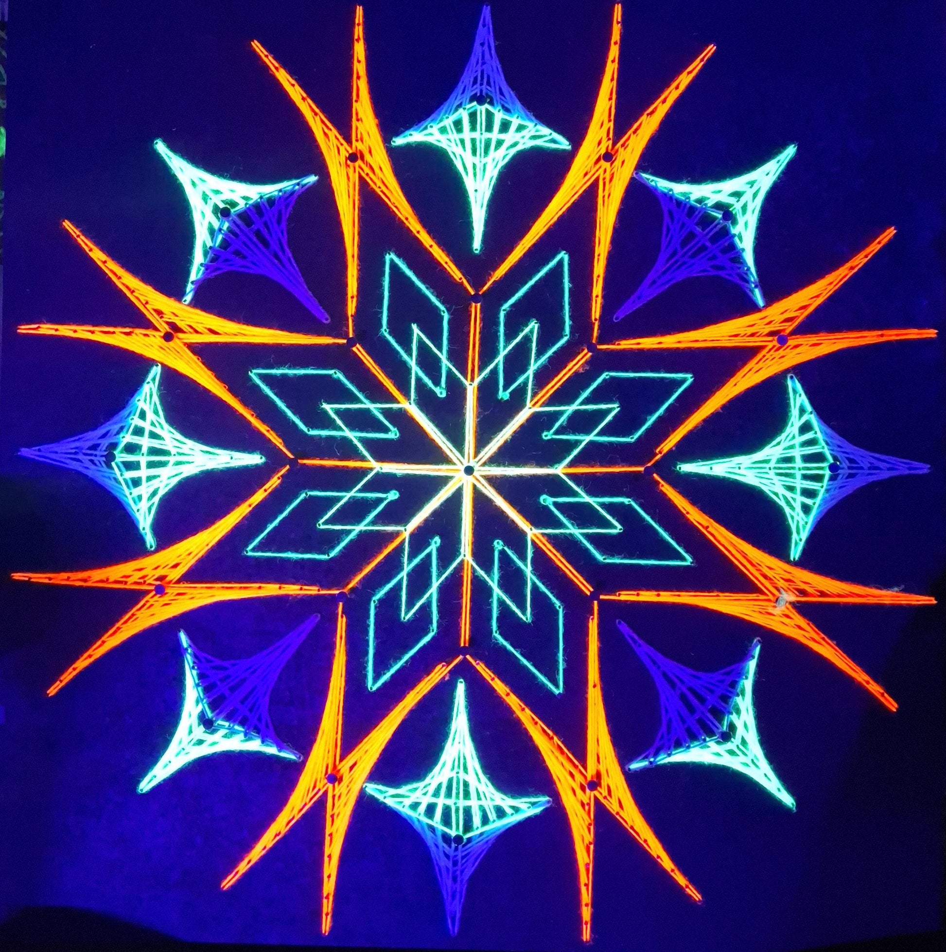 Under UV light, the threads glow beautifully, revealing an additional layer of depth and giving the artwork a subtle yet striking luminous presence.