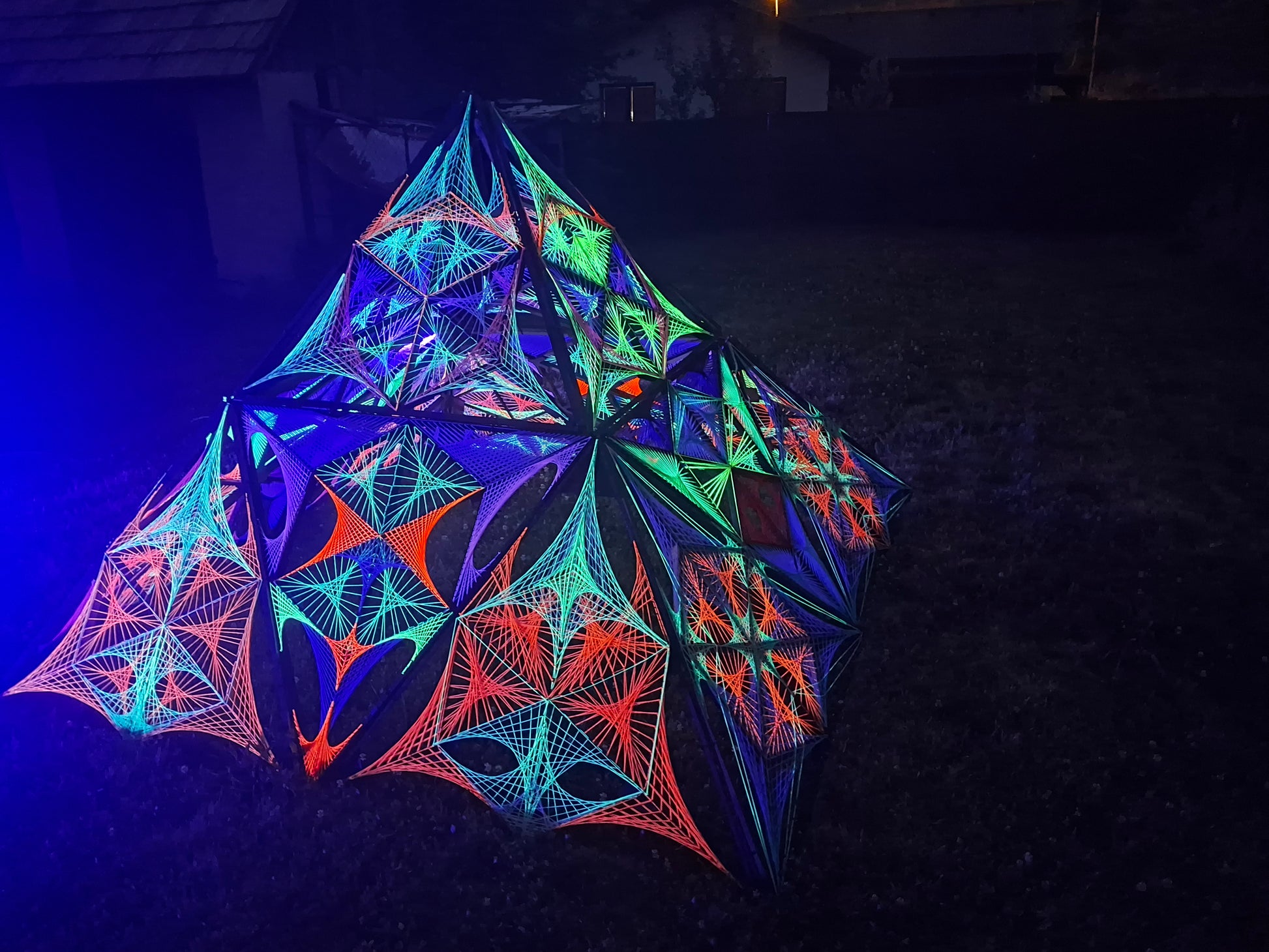 The object is fully modular and transportable. It is designed primarily for psytrance parties and festivals, but it can also be assembled into a DJ stage or used as a central visual element for chillout areas. Under UV light, it feels like a tent from another dimension – functional, yet deeply psychedelic.