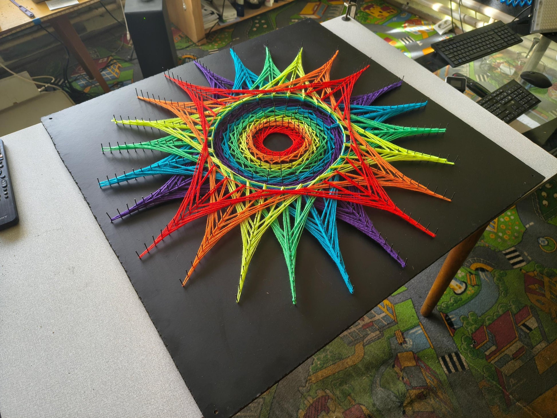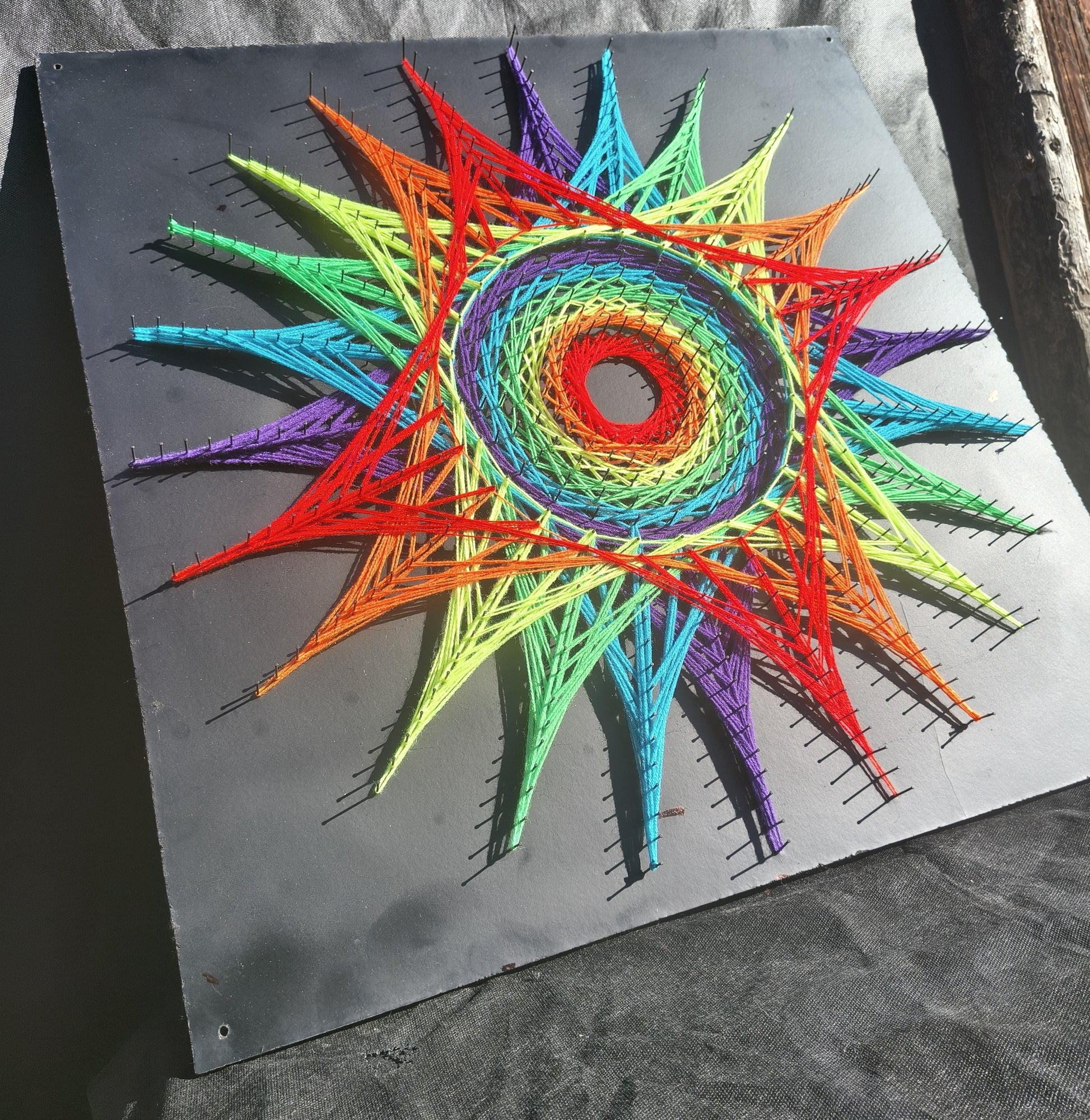 Rainbow Spiral is one of the most refined and sought-after Psybell string art pieces — a vibrant mandala where spiral motion meets star geometry, radiating dynamic and positive energy into any space.