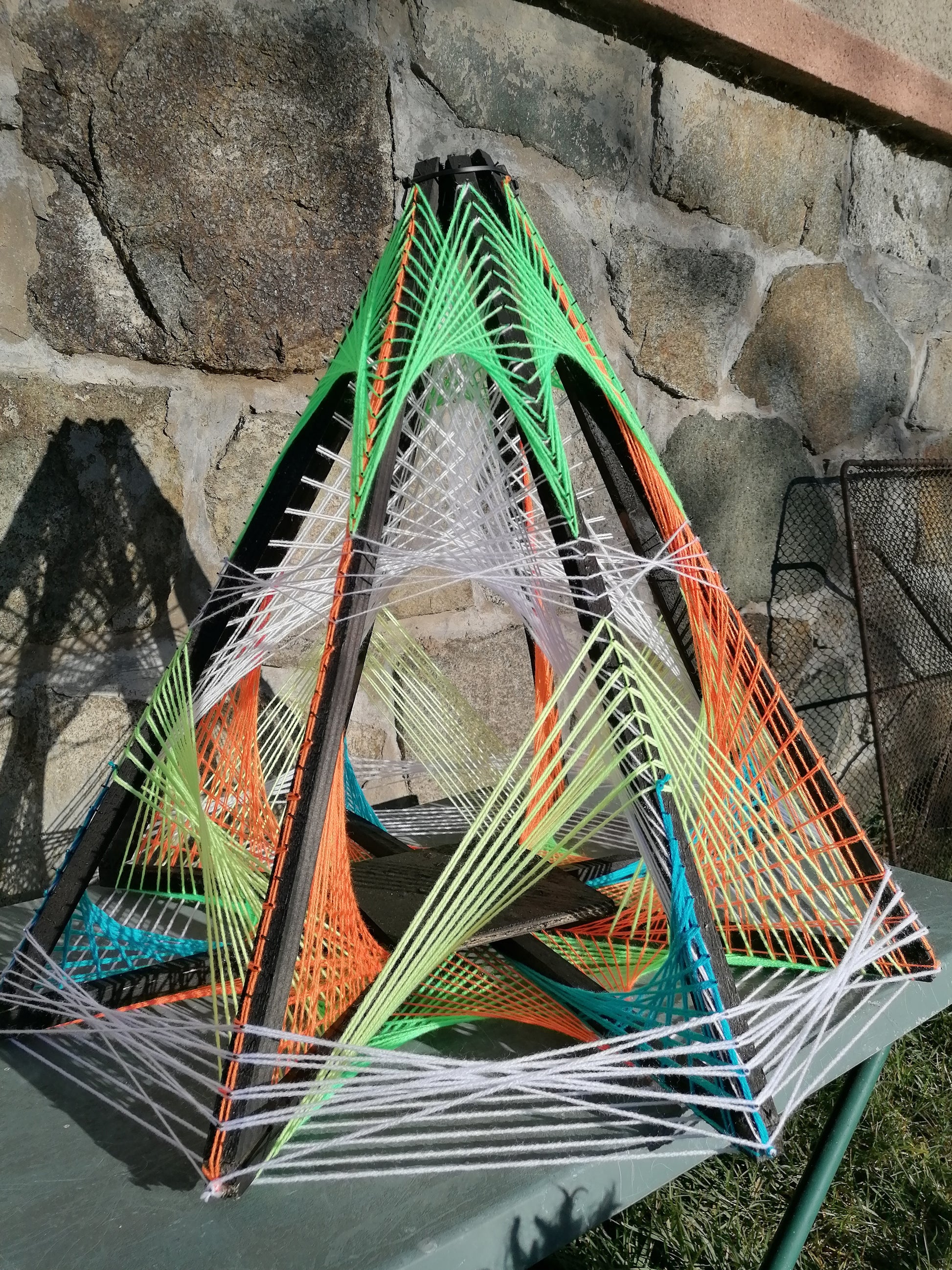 The object is built on layered triangular geometry, where strings intersect in multiple directions and densities. The weaving creates the impression of a rocket-like or crystalline form pointing upward – which inspired the name Octa-Rocket. The shape feels dynamic, as if constantly in motion, even while standing still.