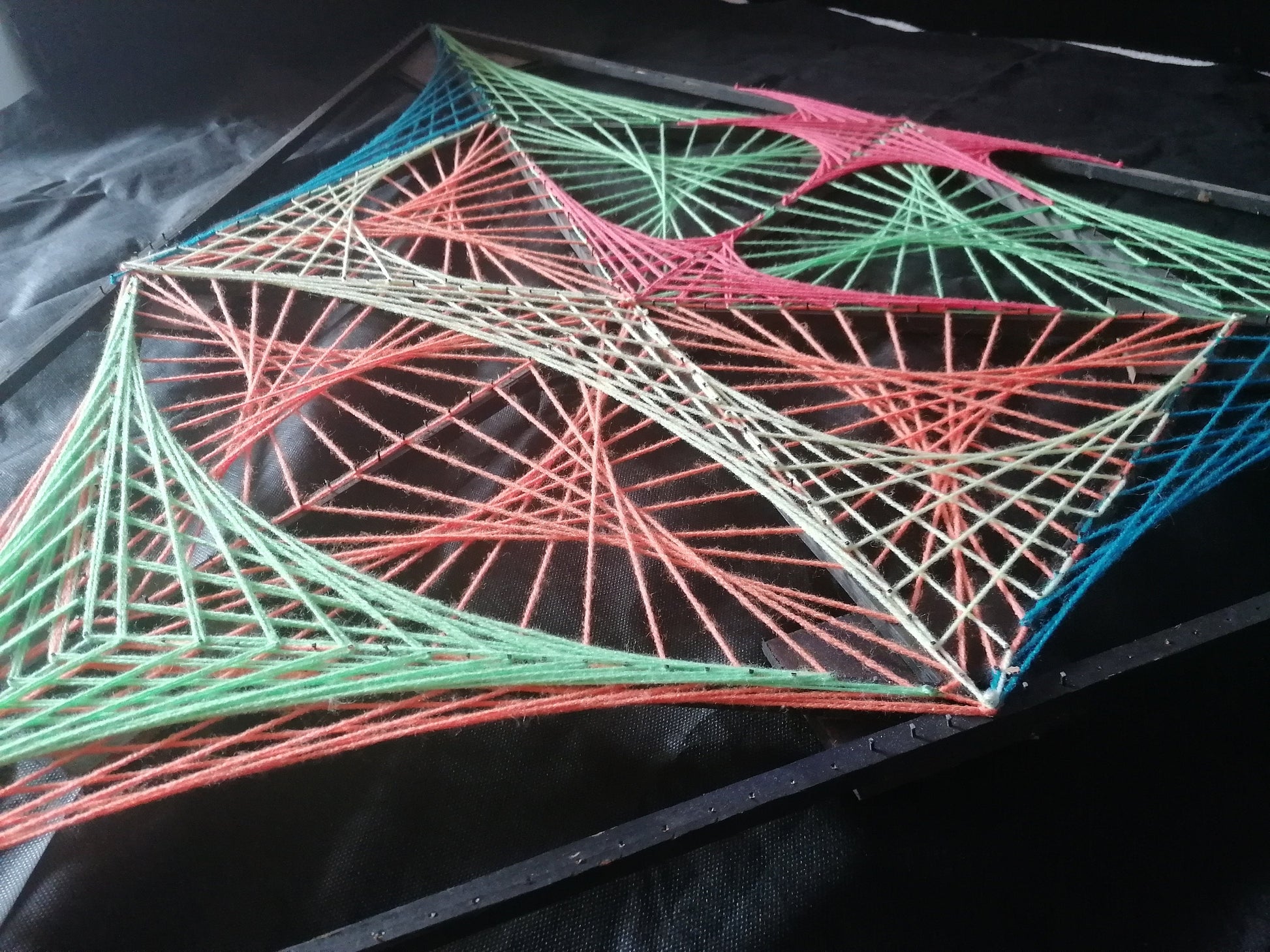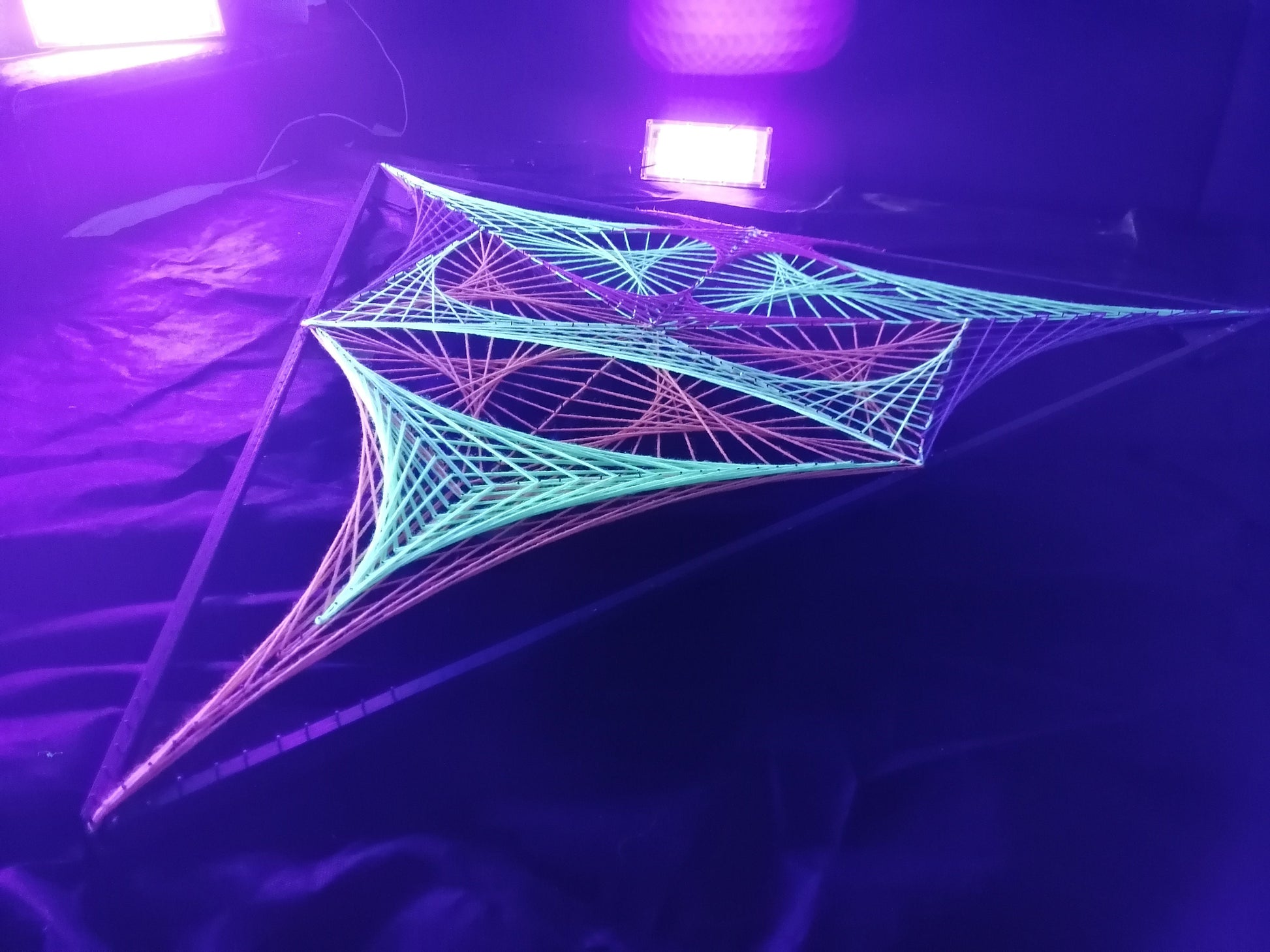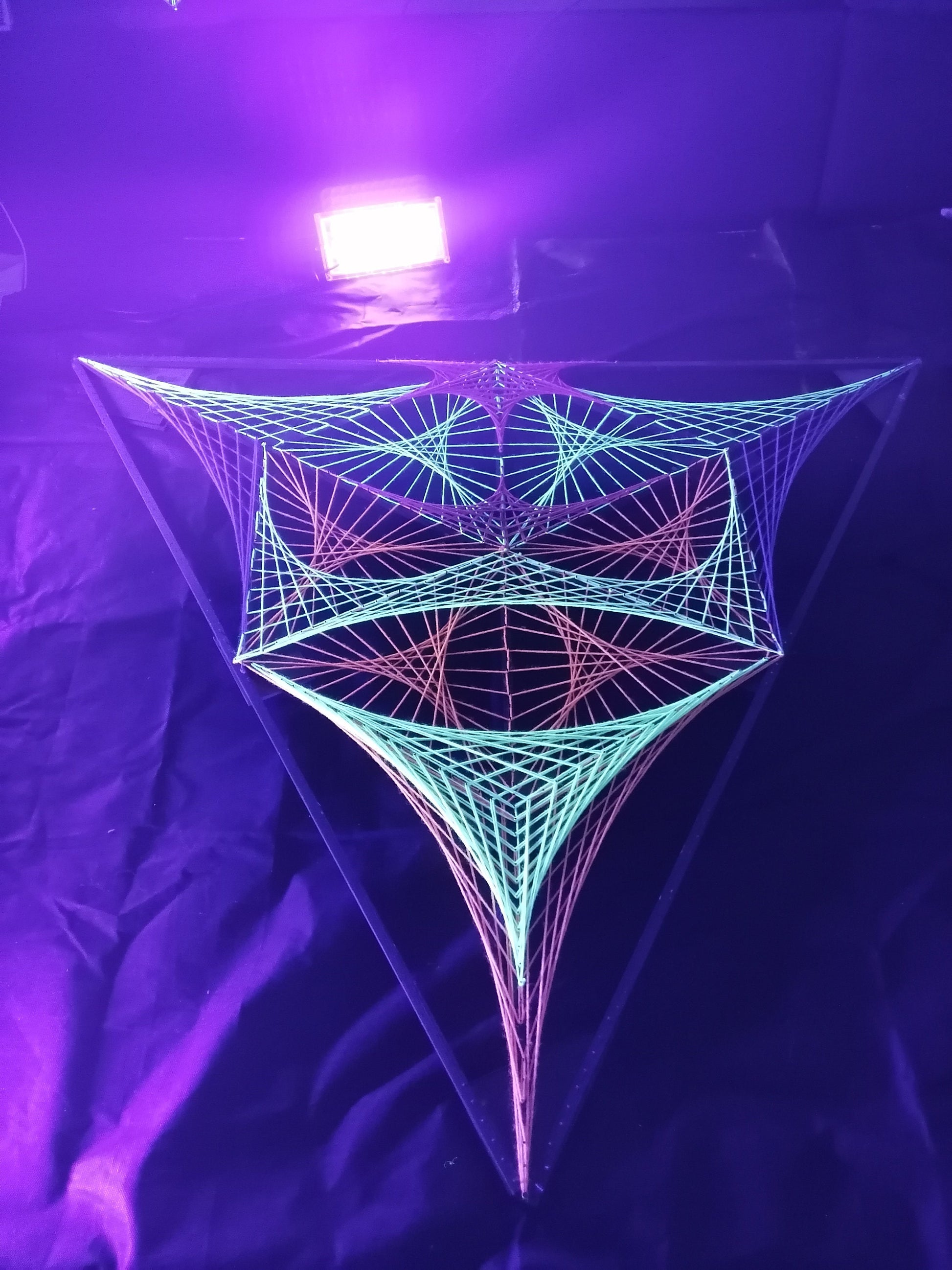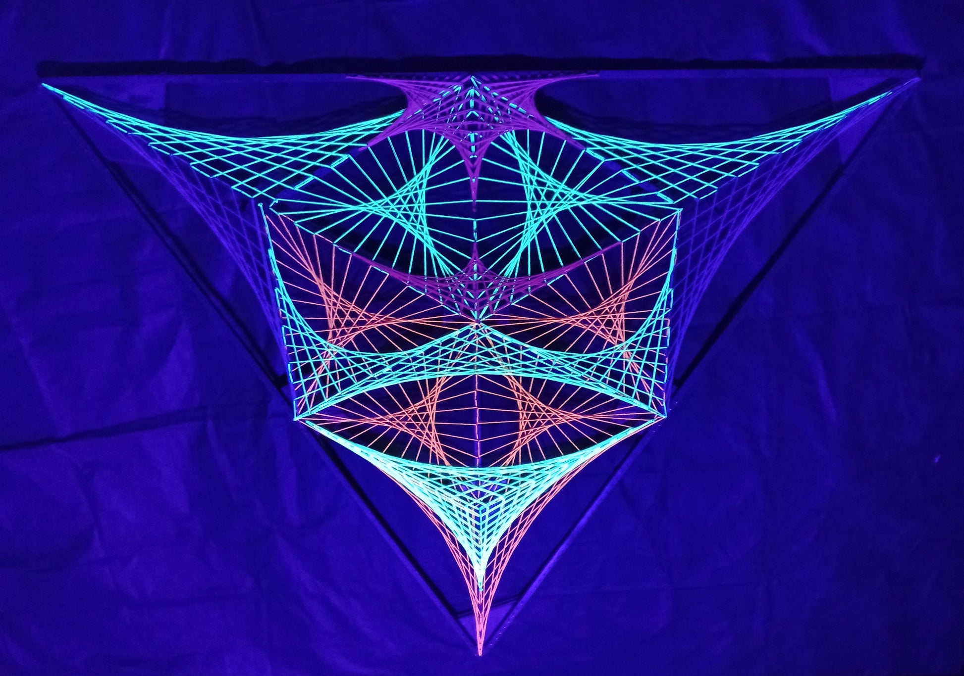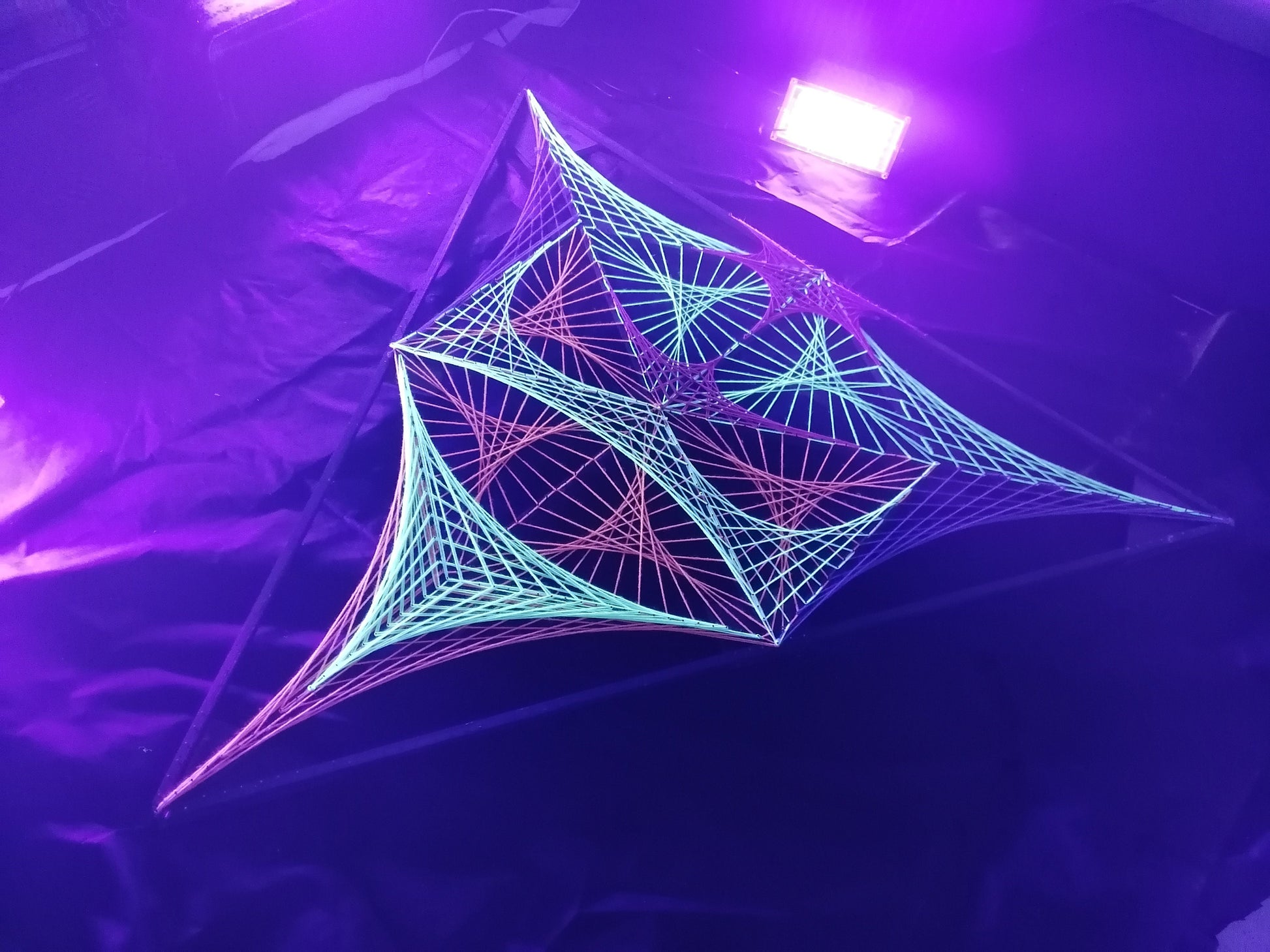 The string composition is woven using the brightest UV-active synthetic acrylic fibers from three proven brands — Bravo, Elian, and Ekofil — carefully selected after years of experimentation. Under UV light, the colors intensify and sharpen the artwork’s strict, almost mechanical character.