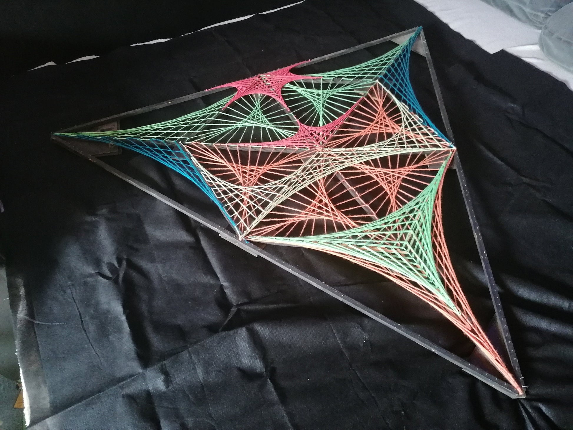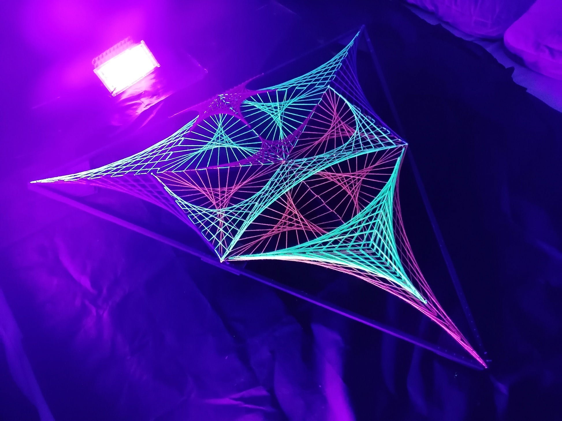 Several advanced techniques were used to elevate this piece beyond standard string art. UV-active neon reflective tape is applied along the entire perimeter, while a hand-crafted dotted mandala was created by melting colored reflective neon silicone directly onto the surface. The nail heads are individually painted with UV-reactive acrylic paint to enhance the blacklight response and visual precision.